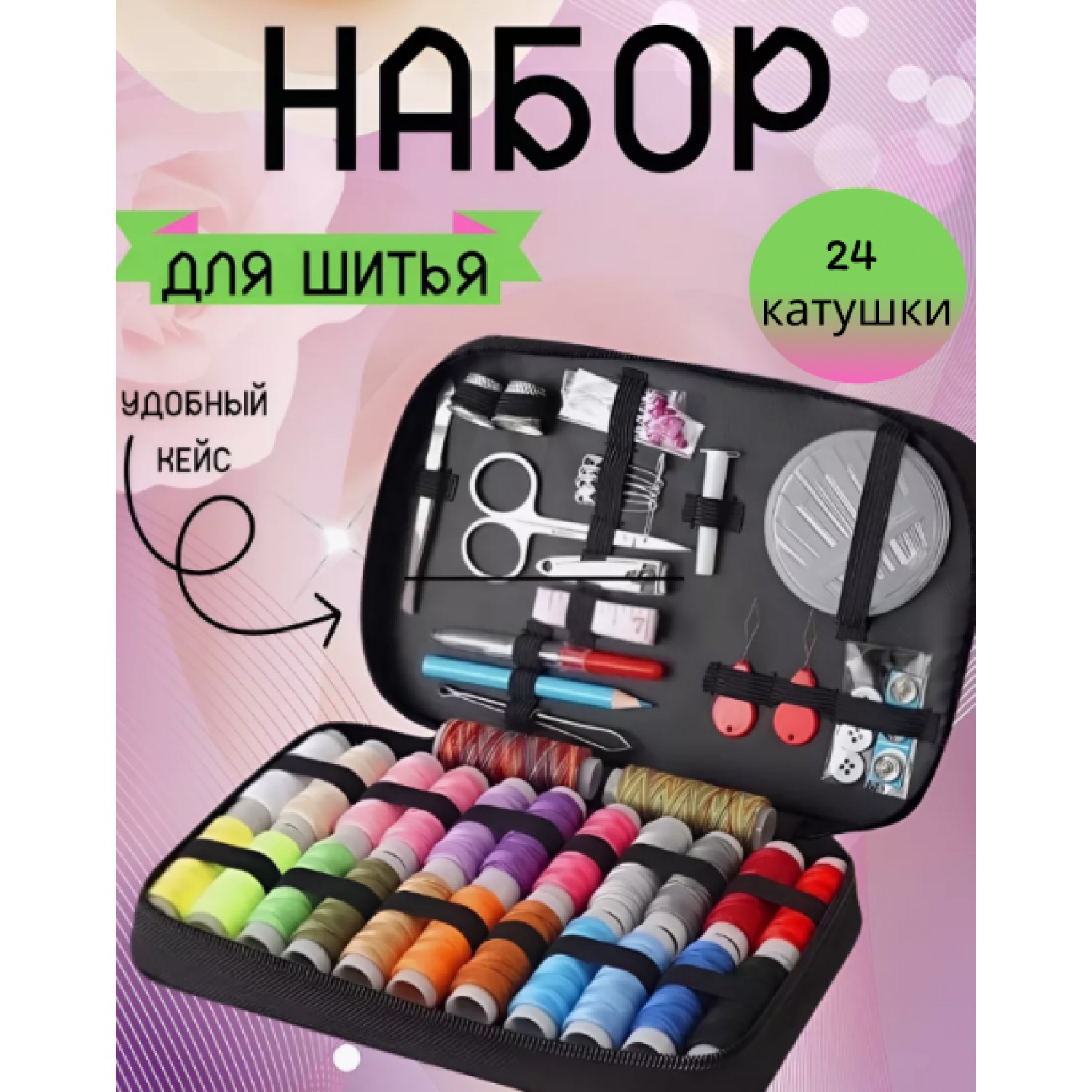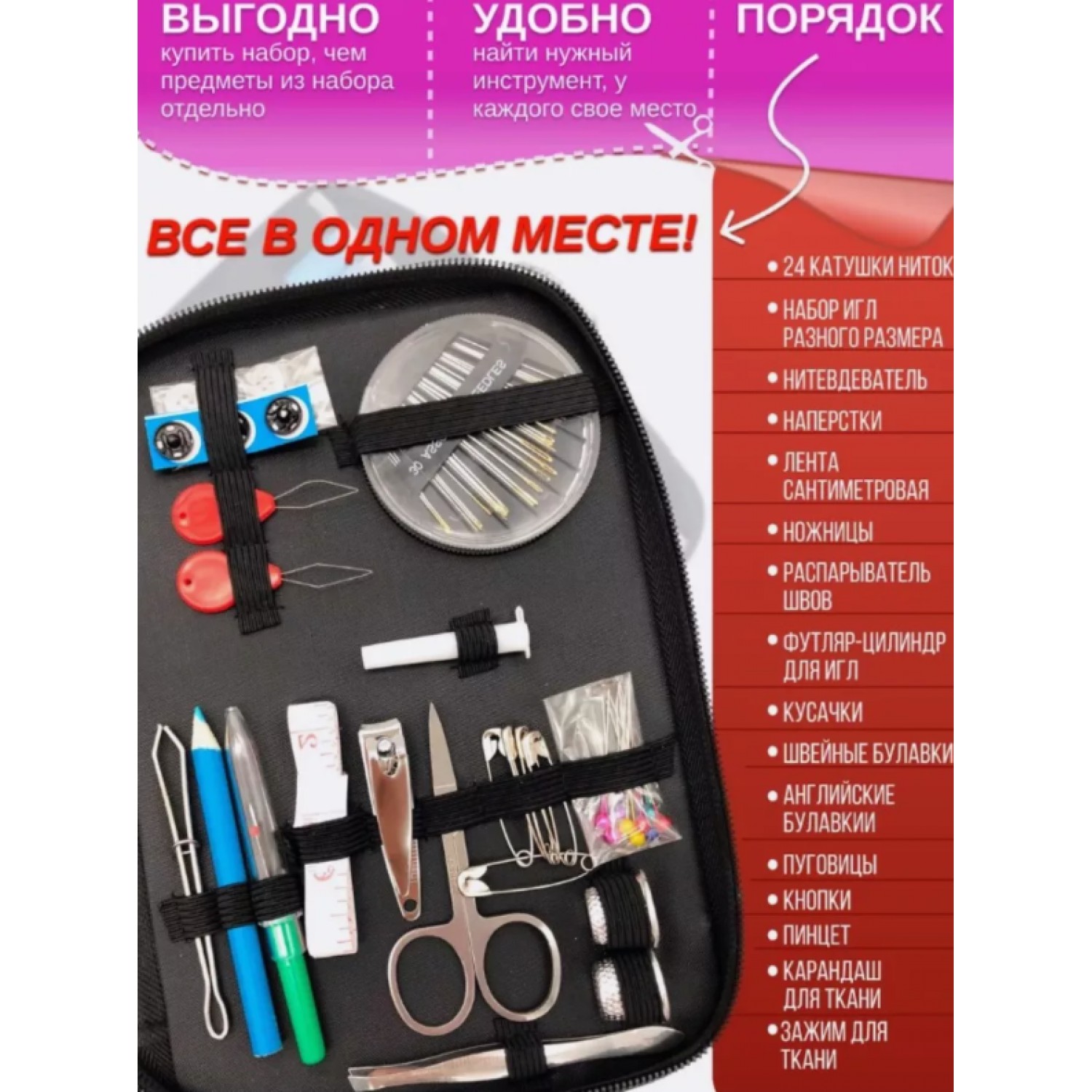 Он включает в себя множество полезных предметов: 30 игл, 24 катушки ниток разных цветов, пуговицы, напёрсток, портновские булавки, кусачки, ножницы, сантиметр, зажимы, распарыватель, карандаш, пинцет и контейнер для хранения. Всё необходимое всегда под рукой!