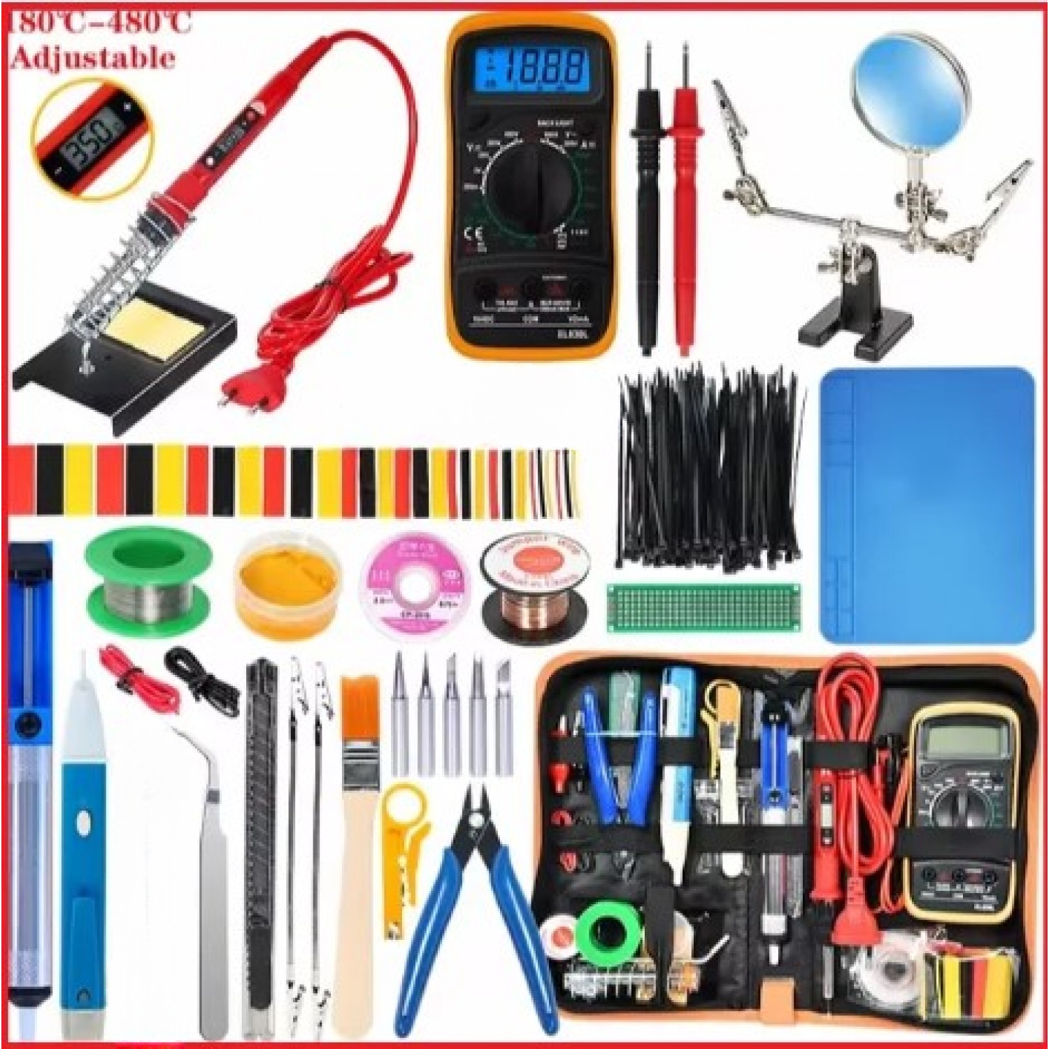 Электрический паяльник – самый необходимый инструмент при выполнении пайки в домашних условиях или профессиональных работ. Он оснащен регулировкой температуры нагревателя и термостойким чехлом. Наш паяльный набор с мультиметром многофункционален. Он будет полезен мужчинам, занимающимся ремонтом электроники и микросхем, а также любыми другими работами, связанными с пайкой оловом проводов. Электропаяльник с подставкой и аксессуарами компактно помещается в специальный органайзер для хранения. Компактный и портативный, он будет незаменимым помощником для всех паяльных работ при проведении ремонта в доме, автомобиле или на работе.