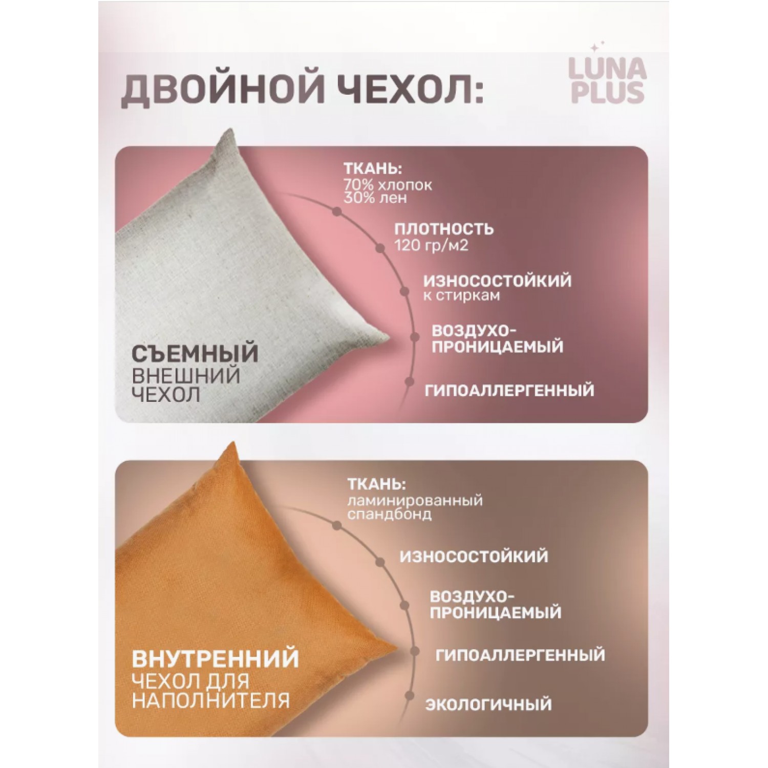 Подушки с ЭКО наполнением из гречневой лузги благоприятно влияют на организм, способствуя эффективному отдыху и полноценному здоровому сну. Двухкамерная подушечка со скорлупой гречихи гипоаллергенна и прекрасно пропускает воздух, поглощает излишнюю влагу и долгое время поддерживает постоянную температуру. Зимой такая большая умная опора удерживает тепло, а летом остается прохладной. Поэтому такие изделия с жесткой поддержкой можно рекомендовать пожилым и людям с повышенным потоотделением. Внутренняя камера состоит из сверхпрочной ткани со скрытой молнией и плотно наполнена шелухой - натуральным и экологически чистым материалом. Перед заполнением, гречка проходит многоступенчатую очистку. Каждая гречишная крупинка, словно маленькая полая пирамидка, беспрепятственно пересыпается внутри, подстраиваясь под очертания тела человека и сохраняя ее на протяжении всей ночи. Она с легкостью заменит перо и другие наполнители, которые могут вызвать аллергию. Благодаря вшитой застежке, вы сможете отрегулировать твердость набивки без каких-либо усилий. Внешняя декоративная наволочка выполнена из 70% хлопка и 30% льна. Такая подкладка станет отличным подарком дедушке или бабушке, маме и папе, зятю тестю свекрови свахе на любой праздник, будь то день рождения (др) или отца, новый год и рождество, 23 февраля или 8 марта.