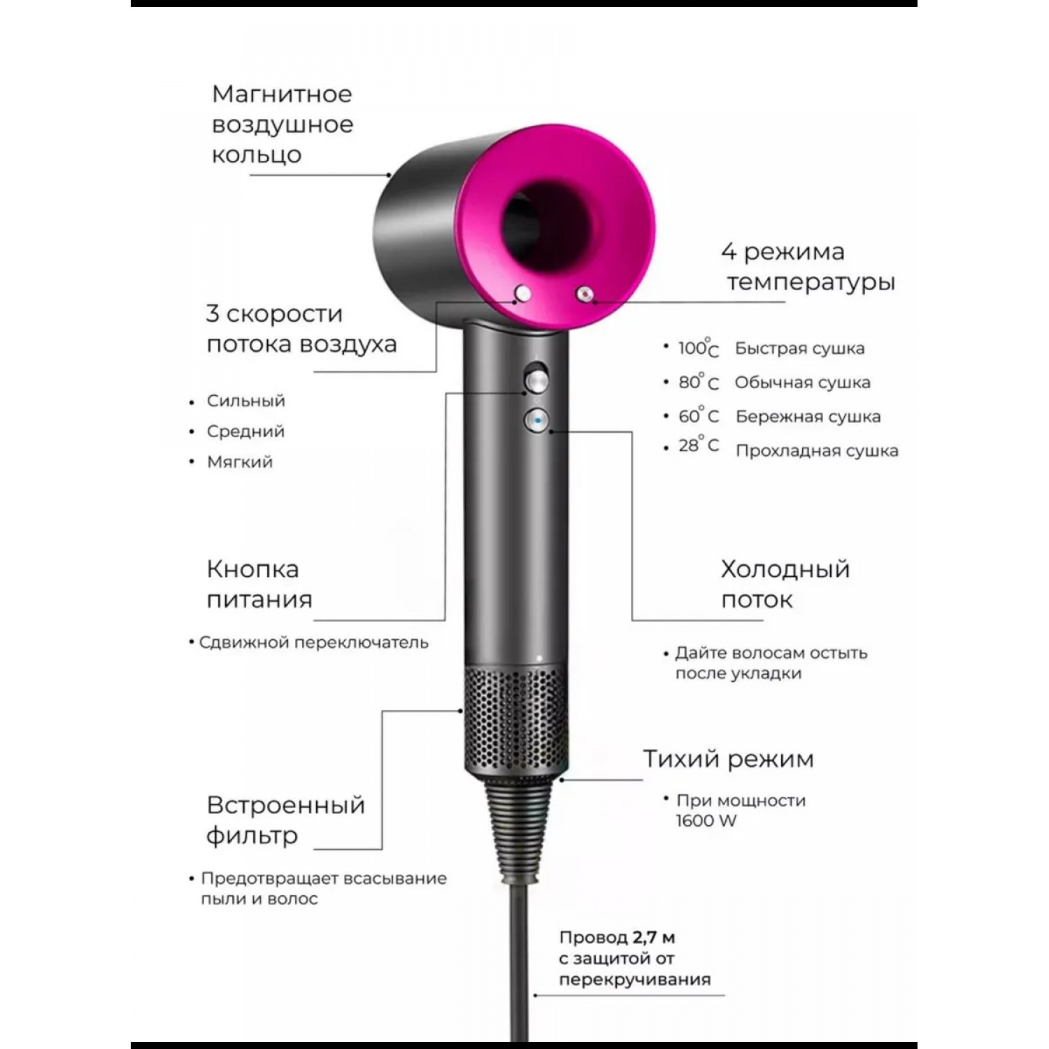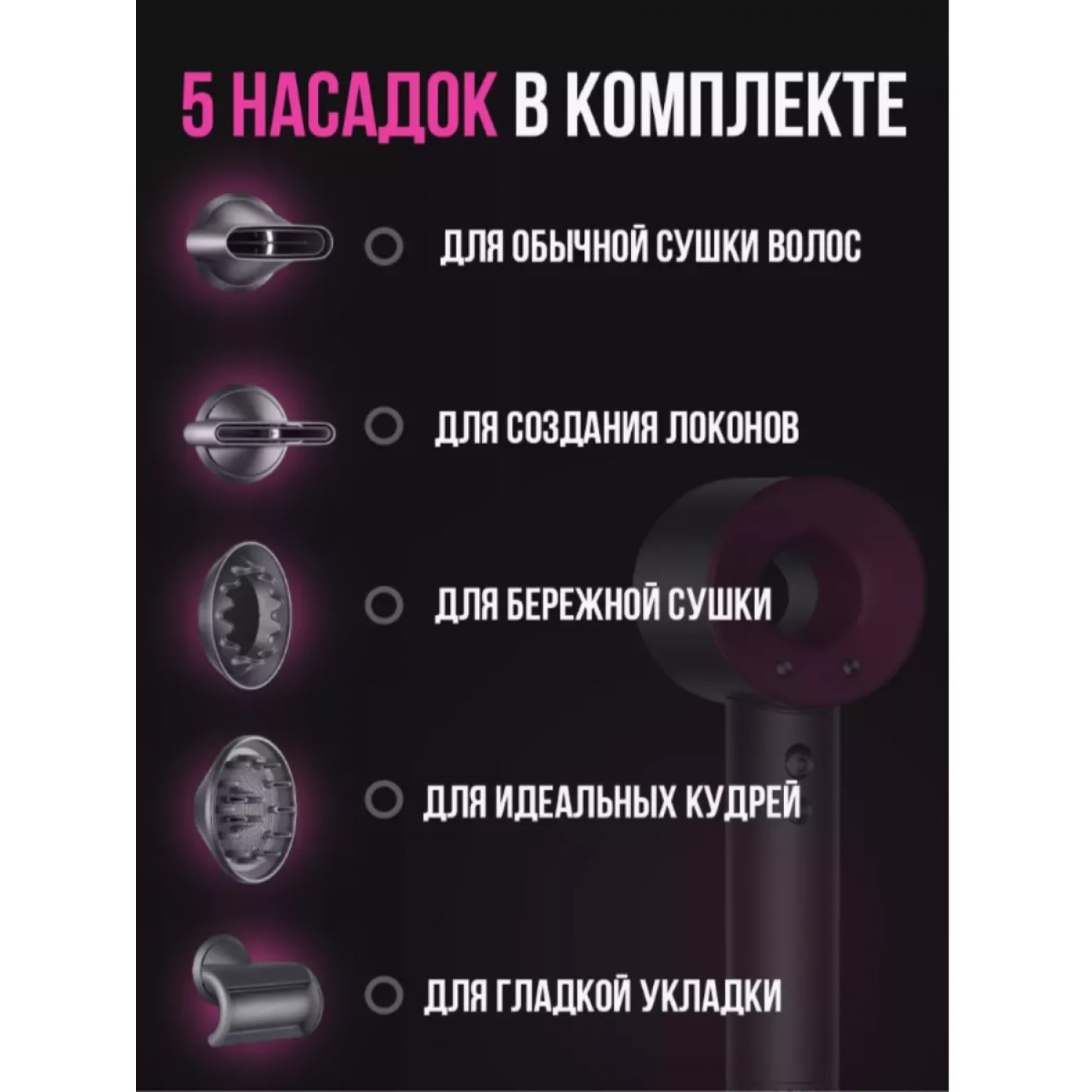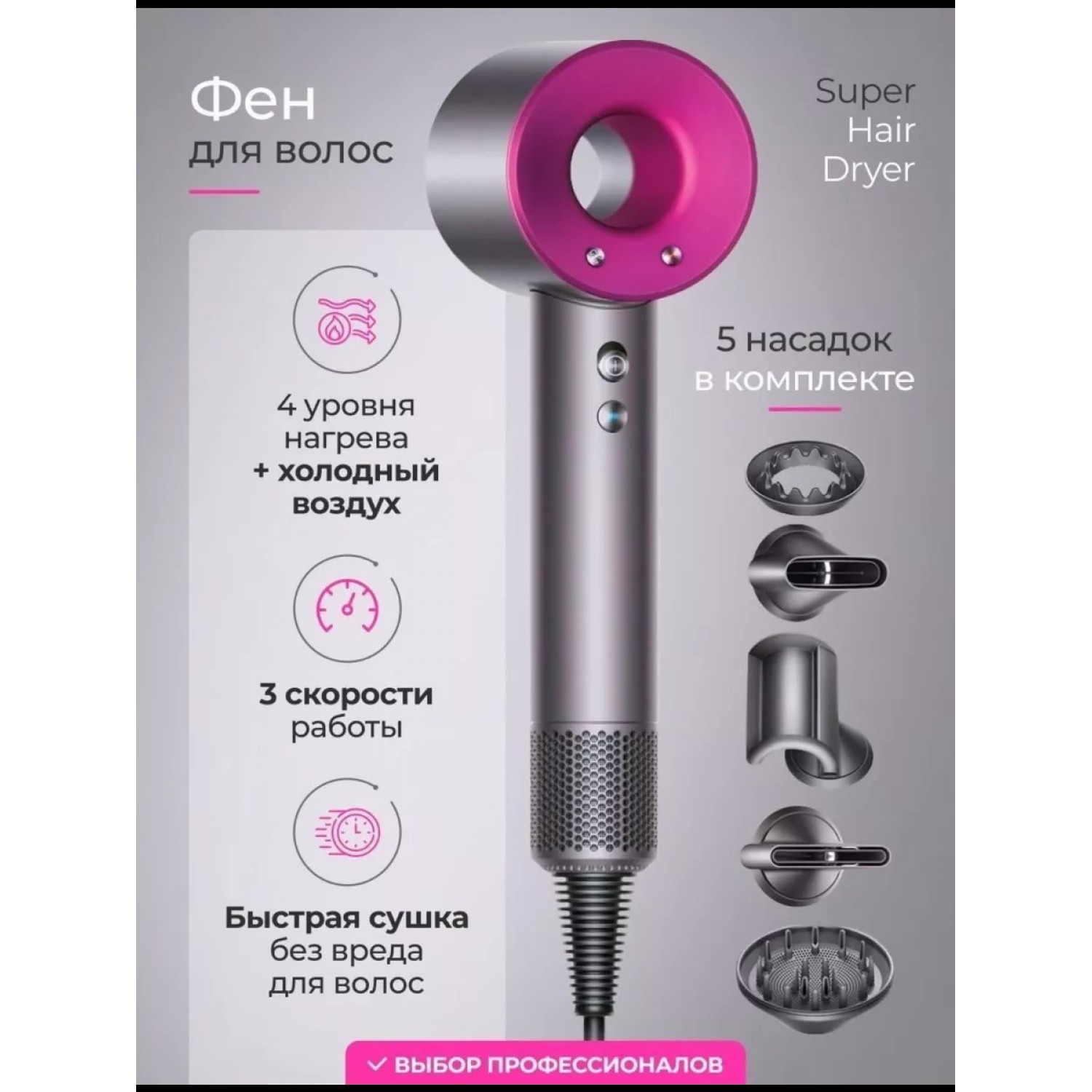 Профессиональный фен с насадками SUPER HAIR DRYER для тех, кто ценит качество, скорость и стиль! Профессиональный фен для волос Super Hair Dryer, с насадками в комплекте. Super Hair Dryer - это современный и стильный фен для волос с функцией быстрой сушки, он обеспечивает безопасный и здоровый уход за волосами любой длины и густоты. Электронная панель управления позволяет подобрать параметры нагрева и скорости обдува, подходящие типу прядей и способу укладки, чтобы обеспечить эффективную сушку не нанося вред волосам. Сильный воздушный поток и нагрев способны справиться даже с самыми непослушными волосами. К фену прилагаются пять насадок, с помощью которых можно сделать особенно красивую и стойкую укладку. Фен Super Hair Dryer сохраняет здоровье волос, создает практически мгновенную сушку. Длина шнура 280 см. позволяют использовать фен даже если розетка находится далеко от зеркала. Фен для волос -это отличный подарок для мужчин и женщин! Благодаря магнитным основаниям менять насадки очень просто, но при этом они совершенно не нагреваются во время работы. Покупка фена подойдёт как для себя, так и в подарок! Порадуйте маму, жену, девушку, бабушку или подругу отличным подарком на день рождения, 8 марта, новый год или другой праздник. Super Hair Dryer - это аналог всем известного премиум фена, в комплекте с 5 насадок: насадка концентратор, насадка диффузор, для непослушных волос, для бережного высушивания волос, насадка для создания направленного потока. 3 режима скорости. 4 режима температуры. Длина шнура 280 см., прекрасно подойдёт для использования в салонах красоты т.к. фен является профессиональным! Очень удобен в использовании! Мультистайлер имеет в комплекте магнитные насадки для придания объема прическе, создания локонов и получения узкого или объемного воздушного потока. Электронная кнопочная панель управления позволяет подобрать параметры нагрева и скорости обдува. Фен для волос с ионизацией профессиональный парикмахерский. Такой инструмент по достоинству оценят как профессионалы, так и бытовые пользователи. Выбирая между такими брендами как Mark Shmidt, Babyliss, Gamma piu и другими, остановите свой выбор на фене Super Hair Dryer и вы останетесь приятно удивлены качеством товара. Фен позволяет быстро создать профессиональную укладку для разных типов волос, и придать локонам здоровый ухоженный вид. Фен для волос с насадками станет отличным приобретением как для салона красоты, так и для домашнего ухода. Лучший подарок парикмахеру. Обязательно перед отправкой, фен проходит все проверки на работоспособность, надёжно упаковывается и отправляется до покупателя целым и невредимым т.к. мы работаем на долгосрочные отношения! Ответим на любые ваши вопросы! Делайте заказ, и вы останетесь довольны!