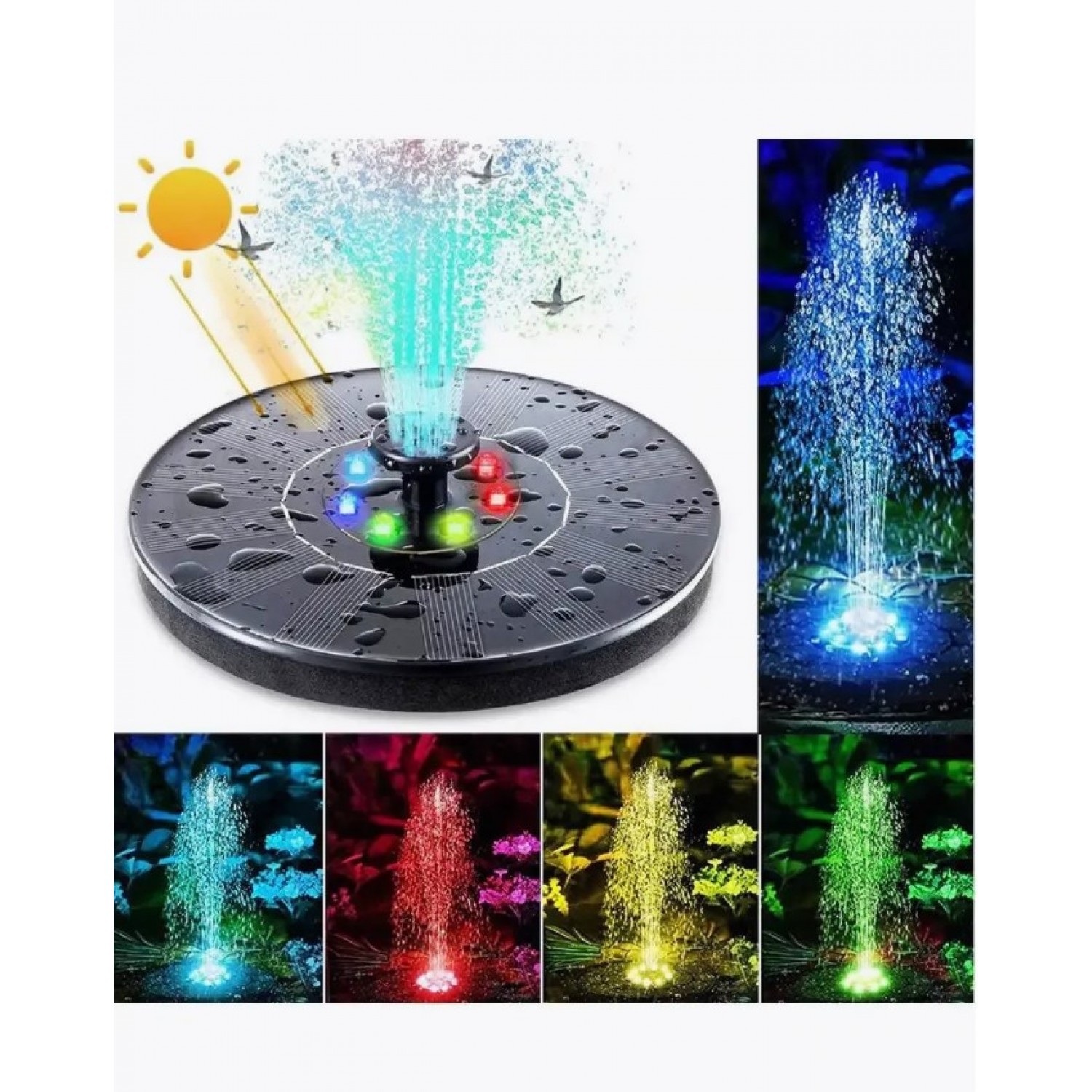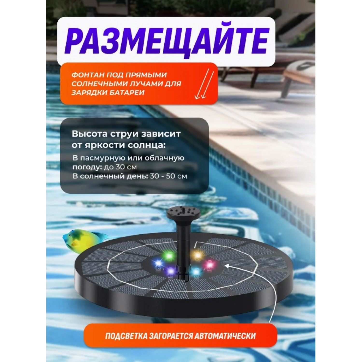 Фонтан на солнечной батарее с подсветкой – отличный декор для Вашего любимого сада. Его можно установить в пруду или бассейне, он идеально подойдет для оформления дачного участка, а также станет отличным развлечением для детей. Плавающий фонтан работает только от солнечной батареи, погруженной в воду и находящейся под прямыми солнечными лучами, не требует подключения к электросети или батарейкам. ВНИМАНИЕ! - Включается только в воде, работает без электричества. Накапливает солнечную энергию, в темное время суток включается автоматически и работает в темноте в течение порядка 3 часов, переливается разноцветными огоньками. Легко перемещается в разные места для использования. Вам просто нужно поместить фонтан в емкость с водой, после попадания достаточно солнечного света (в течение 3х секунд), он начнет работать автоматически. Чем сильнее солнце, тем мощнее фонтан. Высота бьющей струи зависит от яркости солнца и может достигать 50-60 см при очень ярком свете. Диаметр фонтана составляет 16 см. Рекомендации: Убедитесь в достаточном количестве воды для полного погружения насоса. Держите воду, панели и насос в чистоте, так же убедитесь, что тени не закрывают солнечные панели, а насос не заблокирован посторонними предметами. Насос рекомендуется чистить раз в 2-3 недели, в зависимости от чистоты воды. Воплотите в жизнь свои идеи по созданию уникального дизайна сада с помощью садового фонтана на солнечной батарее. Он станет прекрасным дополнением вашего сада и добавит свежести и уюта на вашей даче.