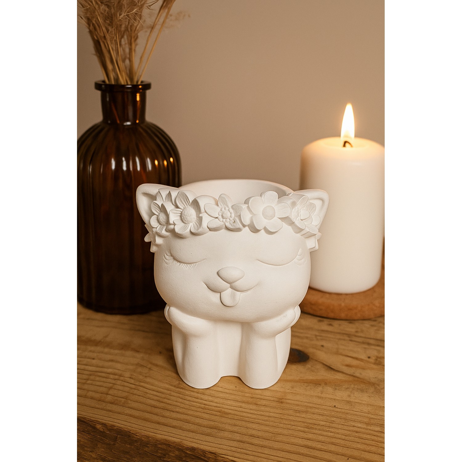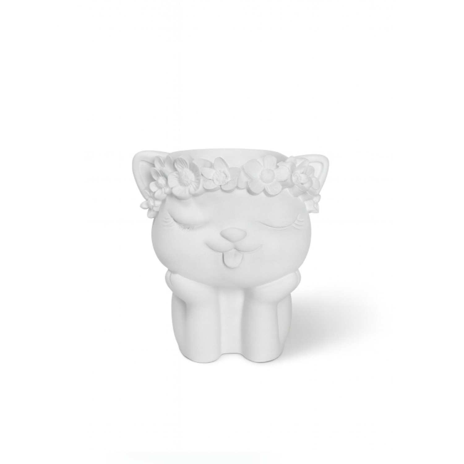 Интерьерная статуэтка из гипса Кошка с венком. Выполнена из экологически чистого, высокопрочного гипса, она имеет плоское дно, благодаря чему устойчивая и удобная. Идеально впишется в любой интерьер дома, кафе, ресторана, салонов красоты и студии красоты или любого другого общественного заведения. Белая минималистичная декоративная фигурка будет уместна в стиле: классика, лофт, модерн, ар-деко, фьюжн, хай-тек и других. Предметы интерьера, которые оценят девушки, и будут гармоничны даже в офисе серьезного мужчины. Гипсовые статуэтки - необычный и модный декор для дома, это товары для дома, которые радуют глаз и поднимают настроение. Отдельные маленькие детали можно долго рассматривать. Гипсовые изделия - это необычные опоры, подставки для книг на полку, украшение комнаты. Гипс чувствителен к воде, поэтому, чтобы статуя вас радовала длительное время и не повредилась, рекомендуем покрыть ее акриловых или любым другим гидрофобным лаком. Гипсовые романтичные фигурки это аксессуары для дома, которые станут отличным подарком женщине или мужчине на новоселье или как красивые сувениры на память в любой значимый день. На изделии допускаются мелкие дырочки, которые свойственны предметам из гипса.