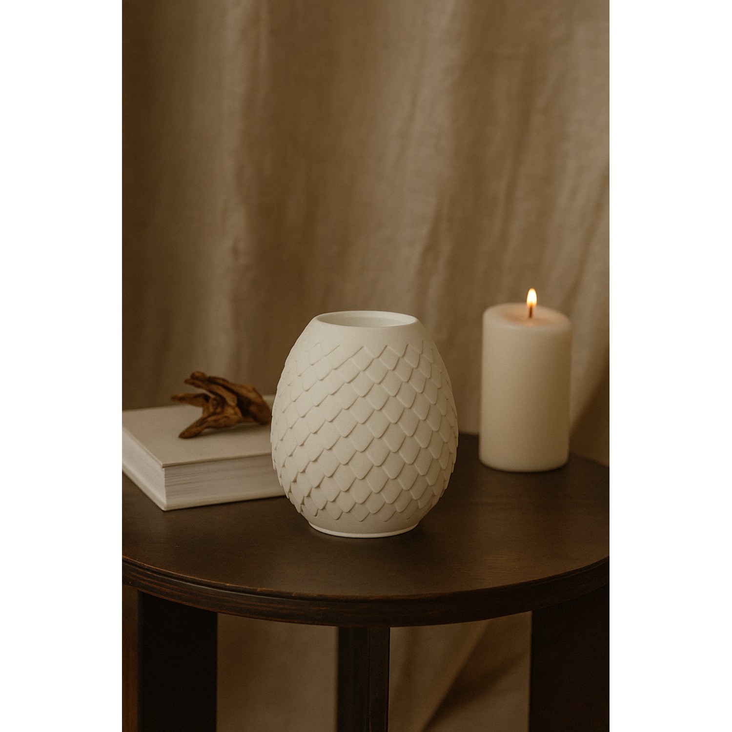 Интерьерная статуэтка из гипса Ваза шишка. Выполнена из экологически чистого, высокопрочного гипса, она имеет плоское дно, благодаря чему устойчивая и удобная. Идеально впишется в любой интерьер дома, кафе, ресторана, салонов красоты и студии красоты или любого другого общественного заведения. Белая минималистичная декоративная фигурка будет уместна в стиле: классика, лофт, модерн, ар-деко, фьюжн, хай-тек и других. Предметы интерьера, которые оценят девушки, и будут гармоничны даже в офисе серьезного мужчины. Гипсовые статуэтки - необычный и модный декор для дома, это товары для дома, которые радуют глаз и поднимают настроение. Отдельные маленькие детали можно долго рассматривать. Гипсовые изделия - это необычные опоры, подставки для книг на полку, украшение комнаты. Гипс чувствителен к воде, поэтому, чтобы статуя вас радовала длительное время и не повредилась, рекомендуем покрыть ее акриловых или любым другим гидрофобным лаком. Гипсовые романтичные фигурки это аксессуары для дома, которые станут отличным подарком женщине или мужчине на новоселье или как красивые сувениры на память в любой значимый день. На изделии допускаются мелкие дырочки, которые свойственны предметам из гипса.