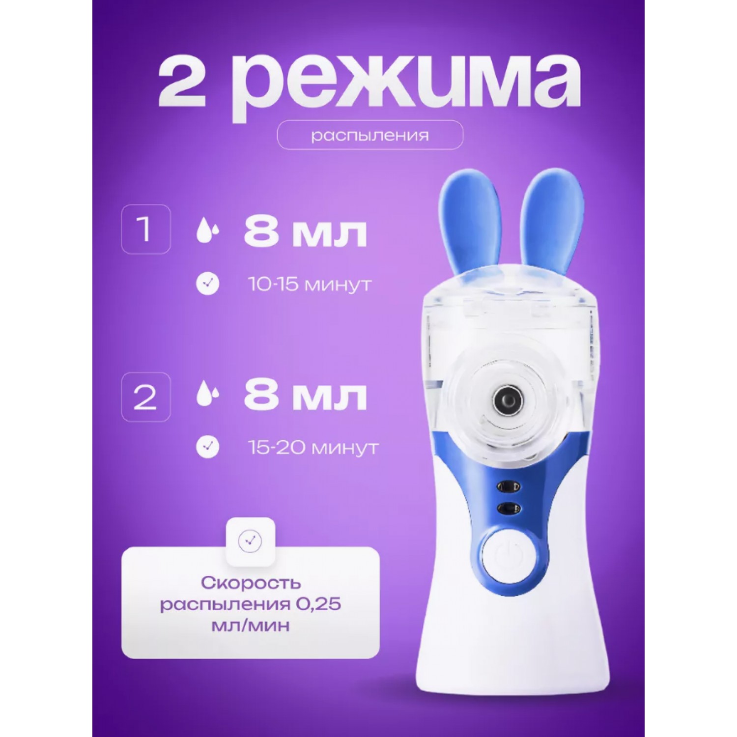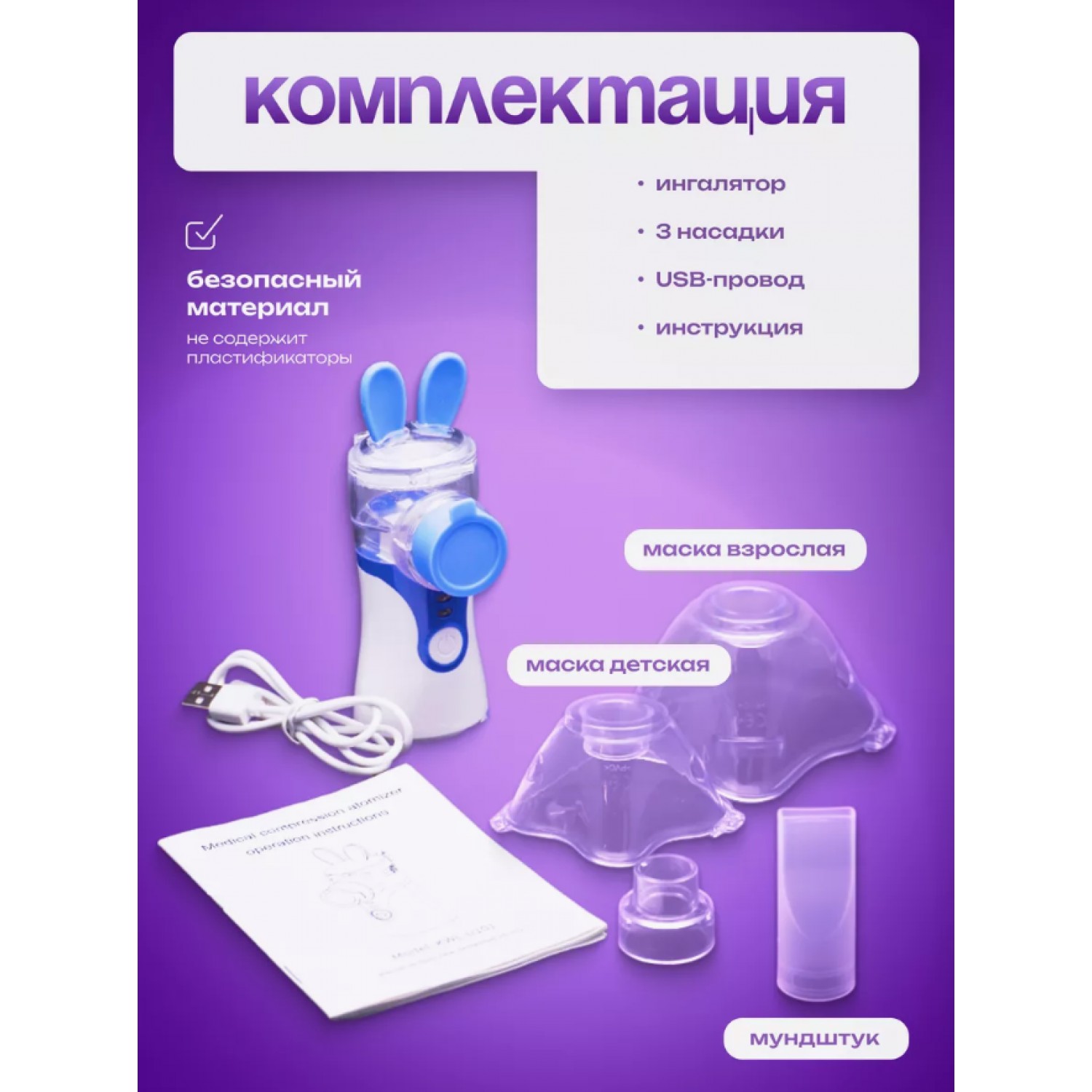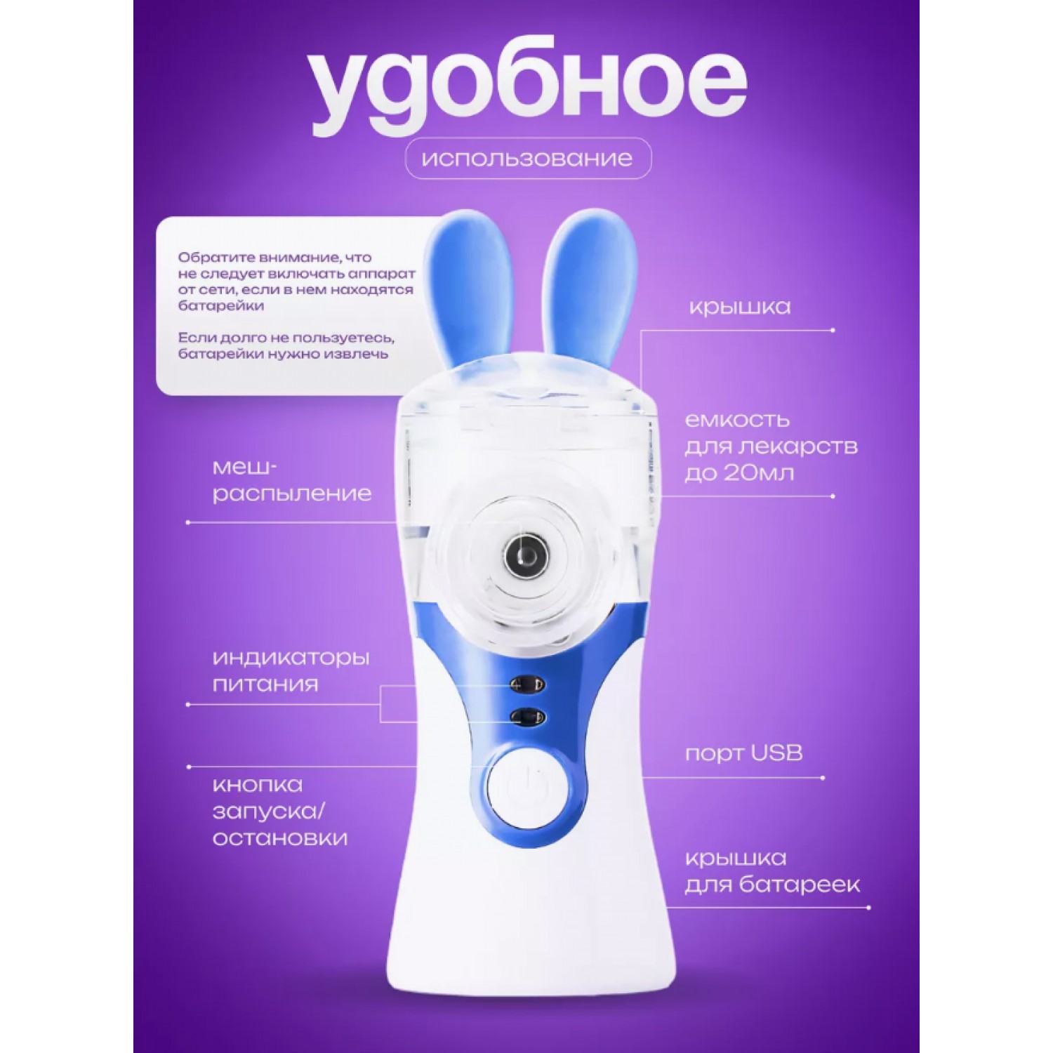 Представляем вам ингалятор для детей и взрослых - портативный бесшумный аппарат, который поможет вам легко и эффективно проводить ингаляции в любое время и в любом месте. Этот электронный небулайзер идеально подходит для лечения астмы, аллергии, простуды, кашля, насморка и других заболеваний дыхательных путей. Ингалятор оснащен специальной маской для детей, которая обеспечивает комфортное и безопасное использование у малышей. Благодаря ультразвуковой технологии Меш, ингалятор обеспечивает мельчайшее распыление жидкости, что позволяет лекарству быстро и эффективно проникнуть в легкие и бронхи. Этот беспроводной ингалятор работает от USB-порта или батареек, что делает его идеальным для использования дома, на работе, в дороге или даже на отдыхе. С помощью специальной насадки для взрослых, вы сможете проводить ингаляции для себя или для своих близких. Ингалятор легкий, компактный и удобный в использовании, имеет милый дизайн в виде зайчика с ушками, безопасен для любого возраста, поскольку сделан из безвредного ABS - пластика. Благодаря бесшумной работе устройства, вы сможете использовать его даже ночью, не беспокоя своего ребенка или себя.