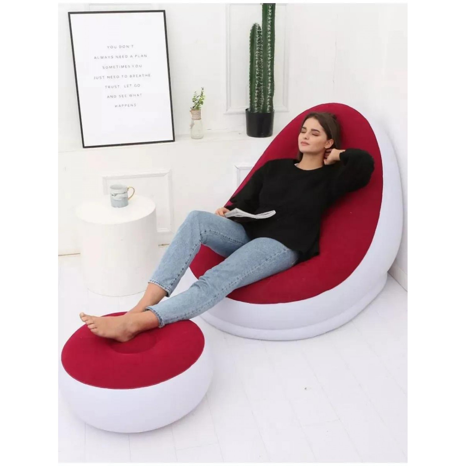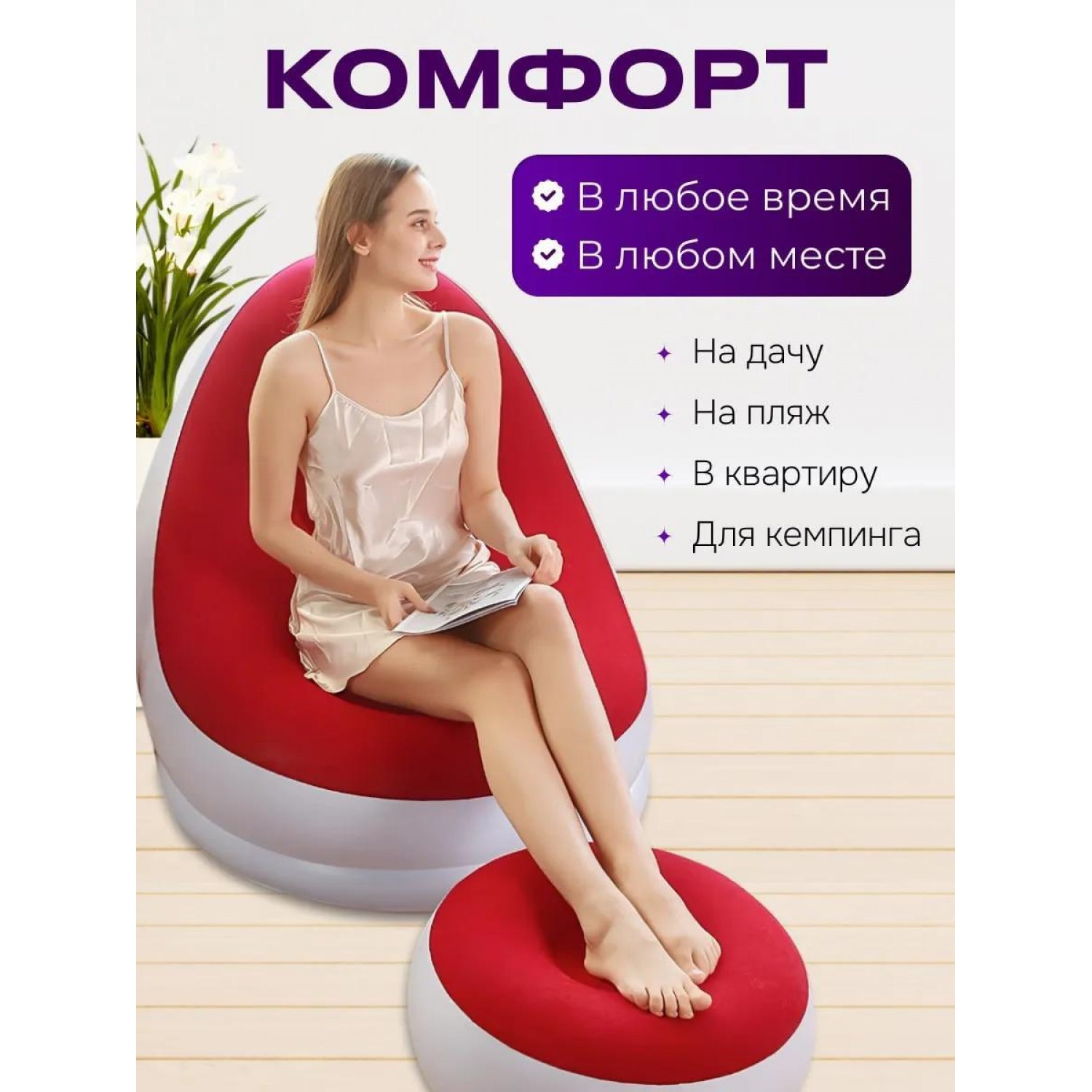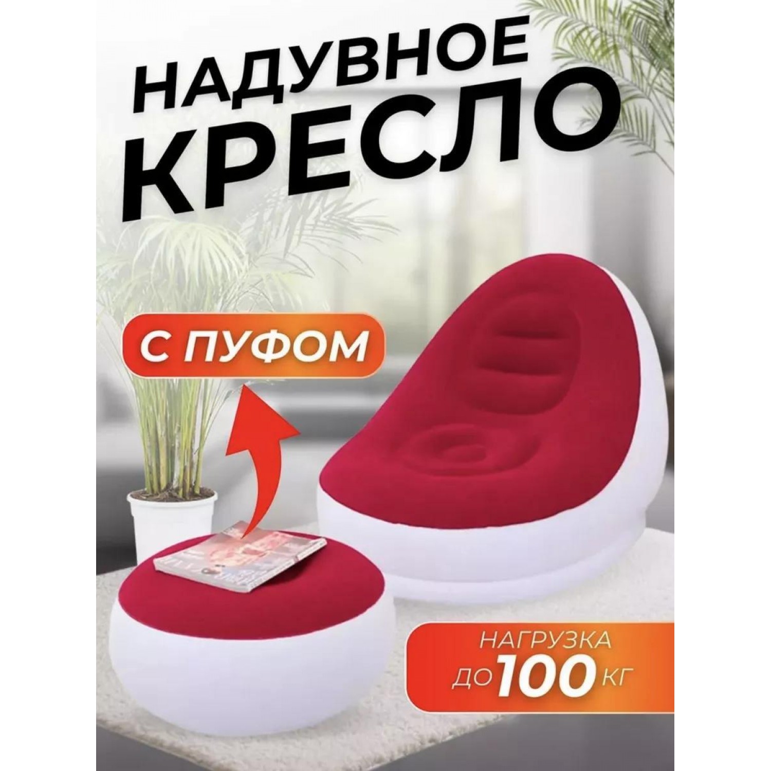 Пуфик хорошее дополнение к креслу очень удобен для расслабления ног . Так же специальная конструкция с хорошей поддержкой не только спины, но и поясницы. В комплект входит надувное кресло, надувной пуф, без насоса.
