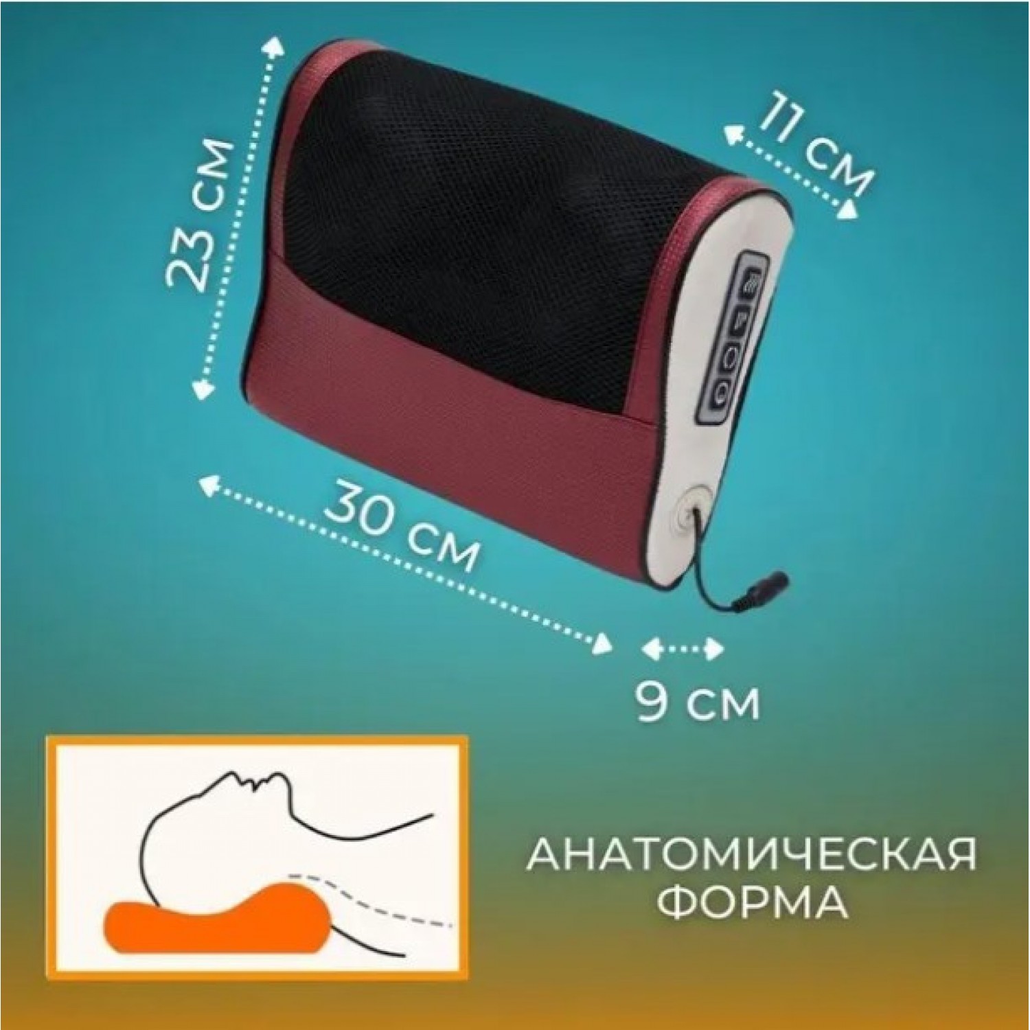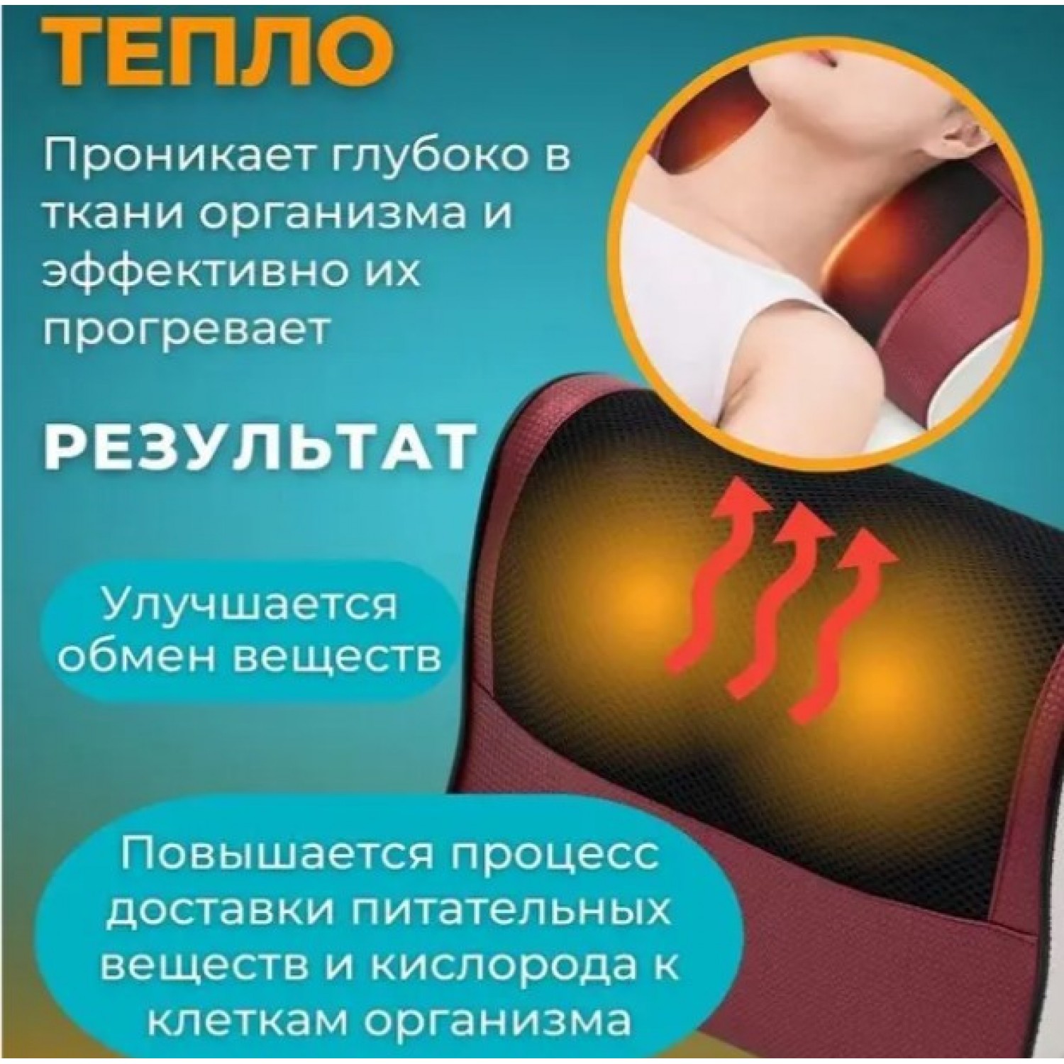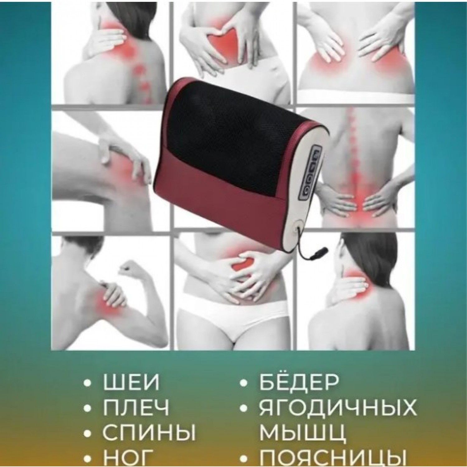 Массажная подушка с функцией инфракрасного прогрева для массажа шеи, плеч, икр, ступней и живота, быстро восстановит силы и устранит напряжение в мышцах. В подушке расположены роликовые массажные головки, которые в точности повторяют движения профессионального массажиста. Во время такого массажа улучшается кровообращение, повышается эластичность мышечных волокон, активируются обменные процессы, снижаются боли в суставах. Всего за несколько минут вы получаете качественное расслабление и просто приятные ощущения: дома, на работе, в офисе, в гостях, в салоне автомобиля, в командировке. Массажную подушку можно эксплуатировать в любых условиях, благодаря наличию двух ремней для удобного крепления. Также регулярное использование подобных аксессуаров положительно влияет на организм, благодаря стимуляции эндокринной и нервной системы, вы получаете избавление от бессонницы и стрессов. Массажер для шеи, плеч, спины станет прекрасным подарком на Новый год, день рождения.