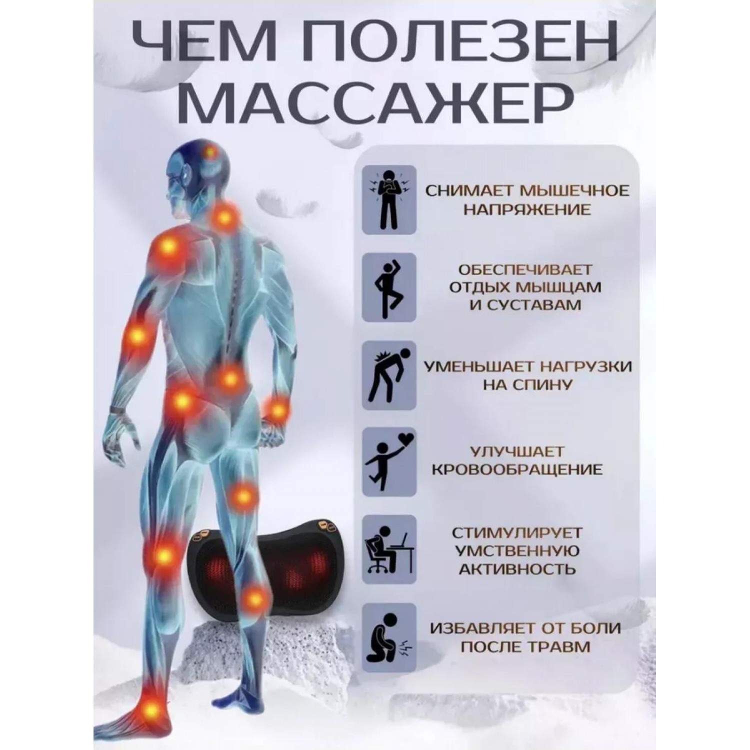 Электрический массажер для тела станет незаменимым спутником во время длительных поездок или работы за столом. Его удобно использовать дома, но не составит труда взять с собой в автомобиль или в путешествие. За счёт улучшения кровообращения он способствует общему оздоровлению организма. Эта электроподушка подойдет как для личного использования, так и в качестве отличного подарка близким.