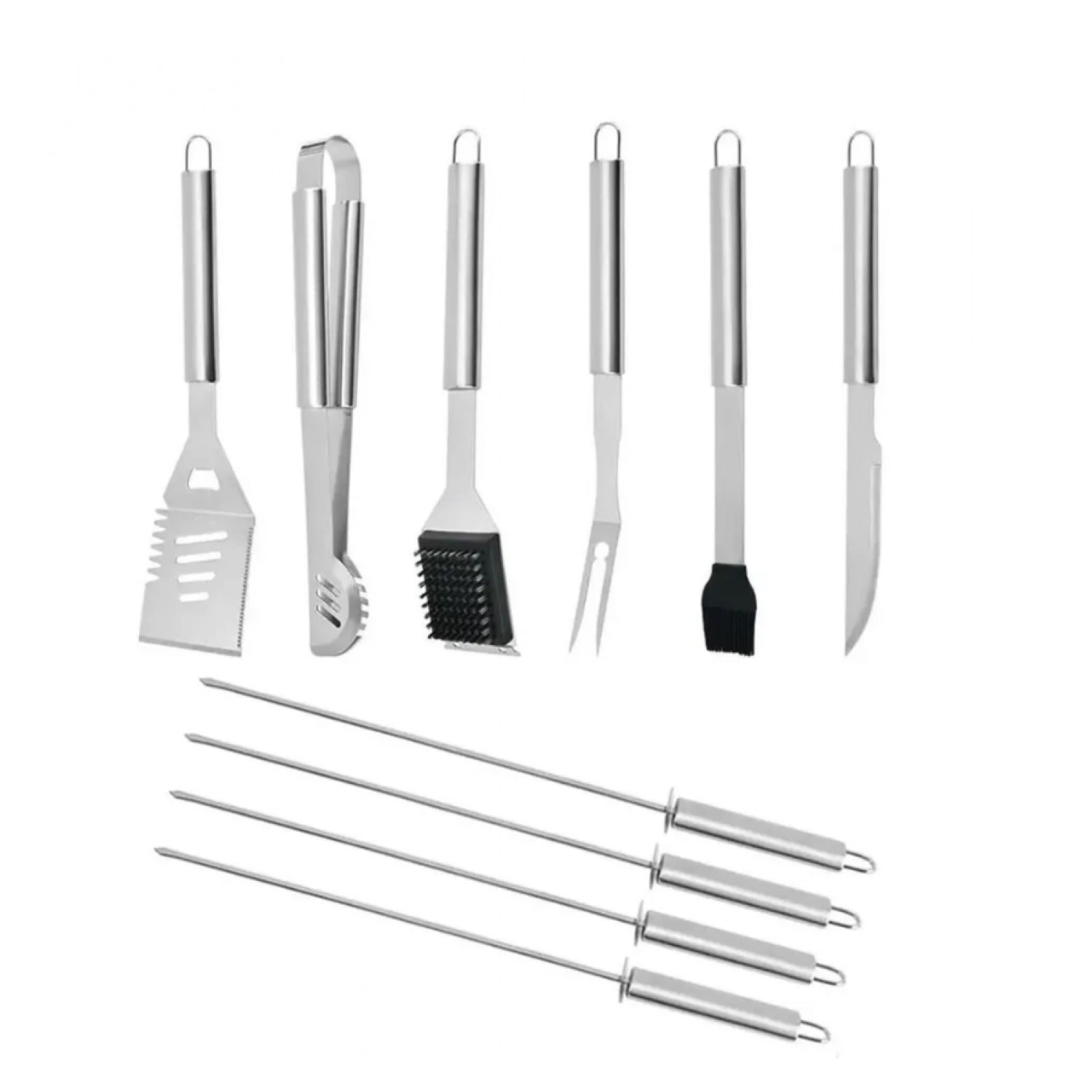 Кисточка, лопатка, нож для барбекю,вилка, шампур: 4шт, щетка, щипцы.