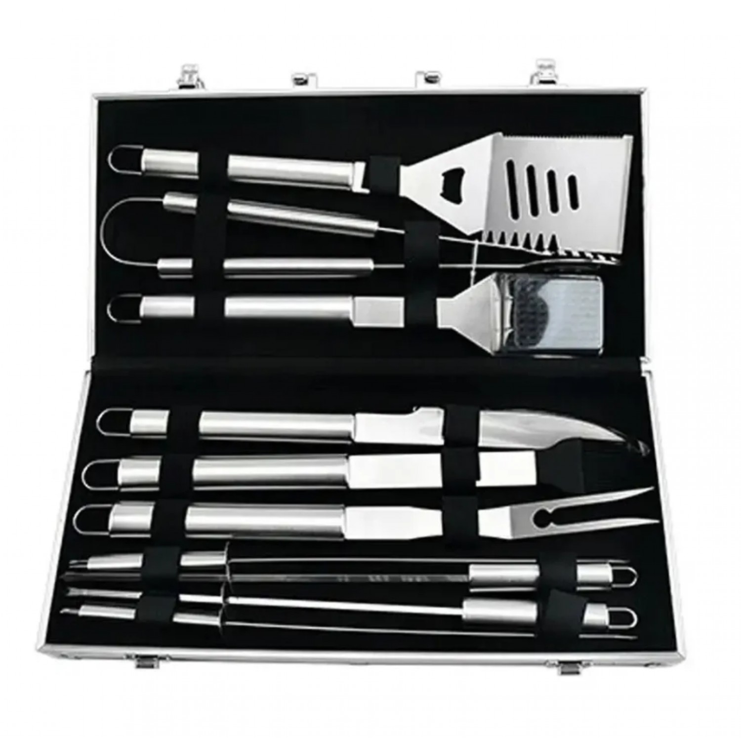 Все предметы набора сделаны из высокопрочной нержавеющей стали, которая не боится высоких температур и легко отмывается от жира и копоти. Для удобства сушки, приборы оборудованы петлями, что бы их легко можно было подвесить. Набор для барбекю состоит из десяти (10) полезных и необходимых инструментов для работы с грилем.