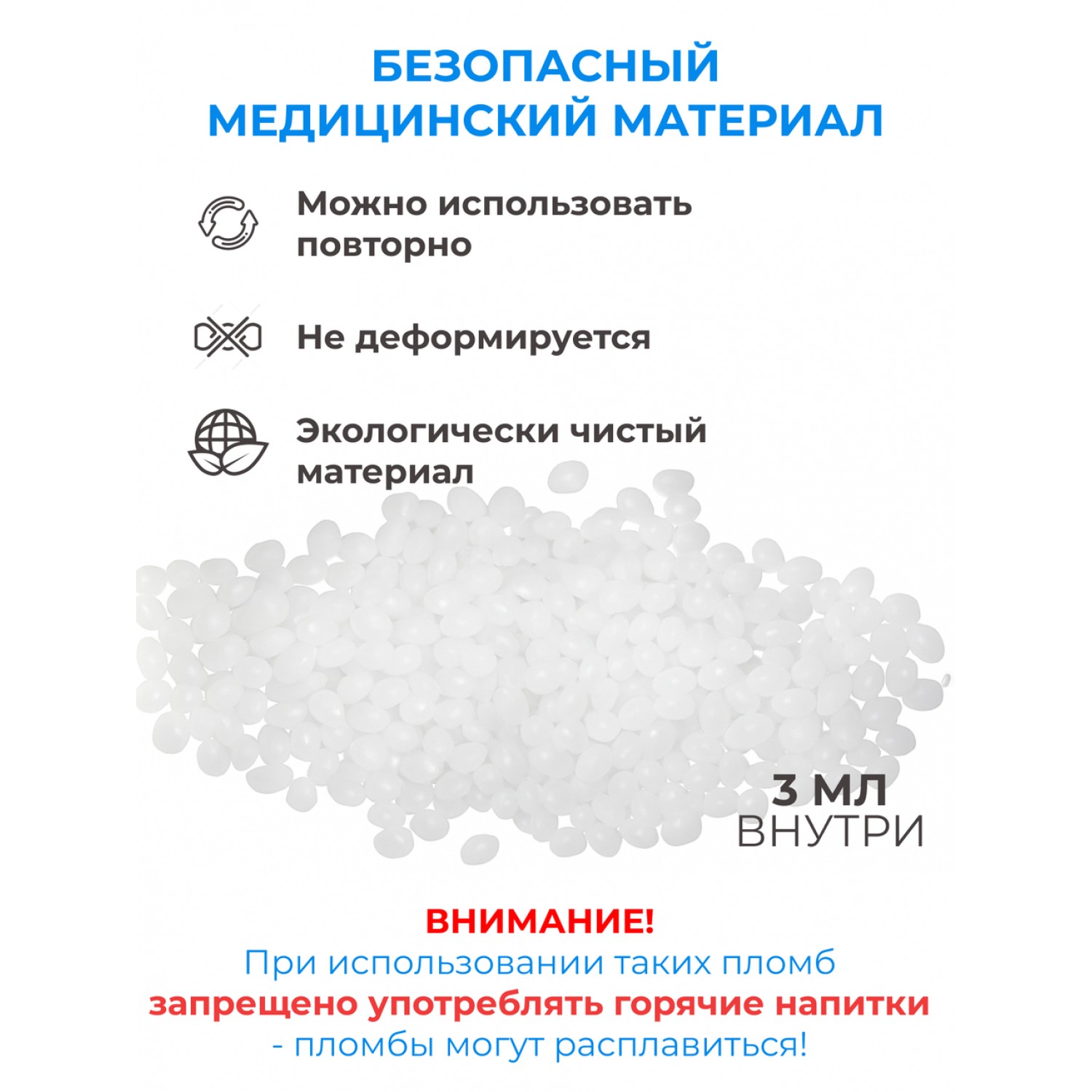 Способ применения: Кладём в миску от 5 до 15 гранул (в зависимости от размера скола). Заливаем горячей водой. Смешиваем до однородной прозрачной массы. Для надёжного сцепления очищаем место установки пломбы. Достаём гель, немного охлаждаем и придаём ему необходимую форму. Плотно помещаем пломбу в изъян зуба, либо имплантируем весь зуб. Остужаем пломбу холодной водой. Если не получилось с первого раза прикрепить пломбу, попробуйте снова. Временные пломбы можно многократно разогревать. Во время пользования имплантом запрещено пить горячие напитки! Стоматологический материал пломба для зубов для срочного ремонта естественных и искусственных зубов. Временная пломба - идеальное решение для всех, кто нуждается в быстром и качественном ремонте зубов. Этот зубной материал позволит вам с легкостью восстановить поврежденный зуб за считанные минуты. Инновационный материал - термоформируемый стоматологический силикон поможет сделать это самостоятельно. Это особенно удобно, если вы оказались в пути или находитесь вдали от доступной стоматологической помощи. С использованием временной пломбы для зубов вы сможете самостоятельно провести ремонт зуба: отличный вариант для временной пломбы, устранения щелин и даже полноценной замены целого зуба, скола (силиконовые накладные виниры). Пломба для зуба избавит вас от мучительных болей, при приеме пищи или скроет дефекты отсутствия зубов. Сами гранулы выполнены из высококачественного материала - термоформируемого стоматологического силикона, который позволяет им долго сохранять свою прочность и естественный внешний вид. Гиппоаллергенный материал полностью безопасен при использовании. Временная пломба для зубов - это универсальный комплект, который содержит материалы для пломбировочного ремонта верхних и нижних зубов. Она может использоваться для временной фиксации брекетов, имплантов, виниров, накладных зубов, вставная челюсть и других протезов. Набор можно использовать для формирования женских или мужских накладных зубов, как виниры и вампирские клыки на праздник или хэллоуин. Они прекрасно смотрятся и дополнят вашу индивидуальность.