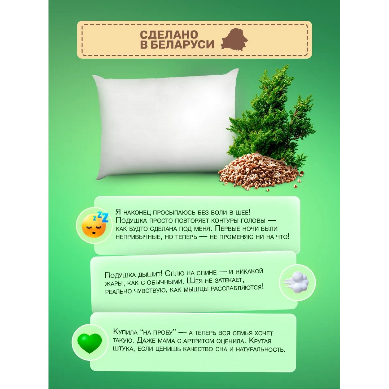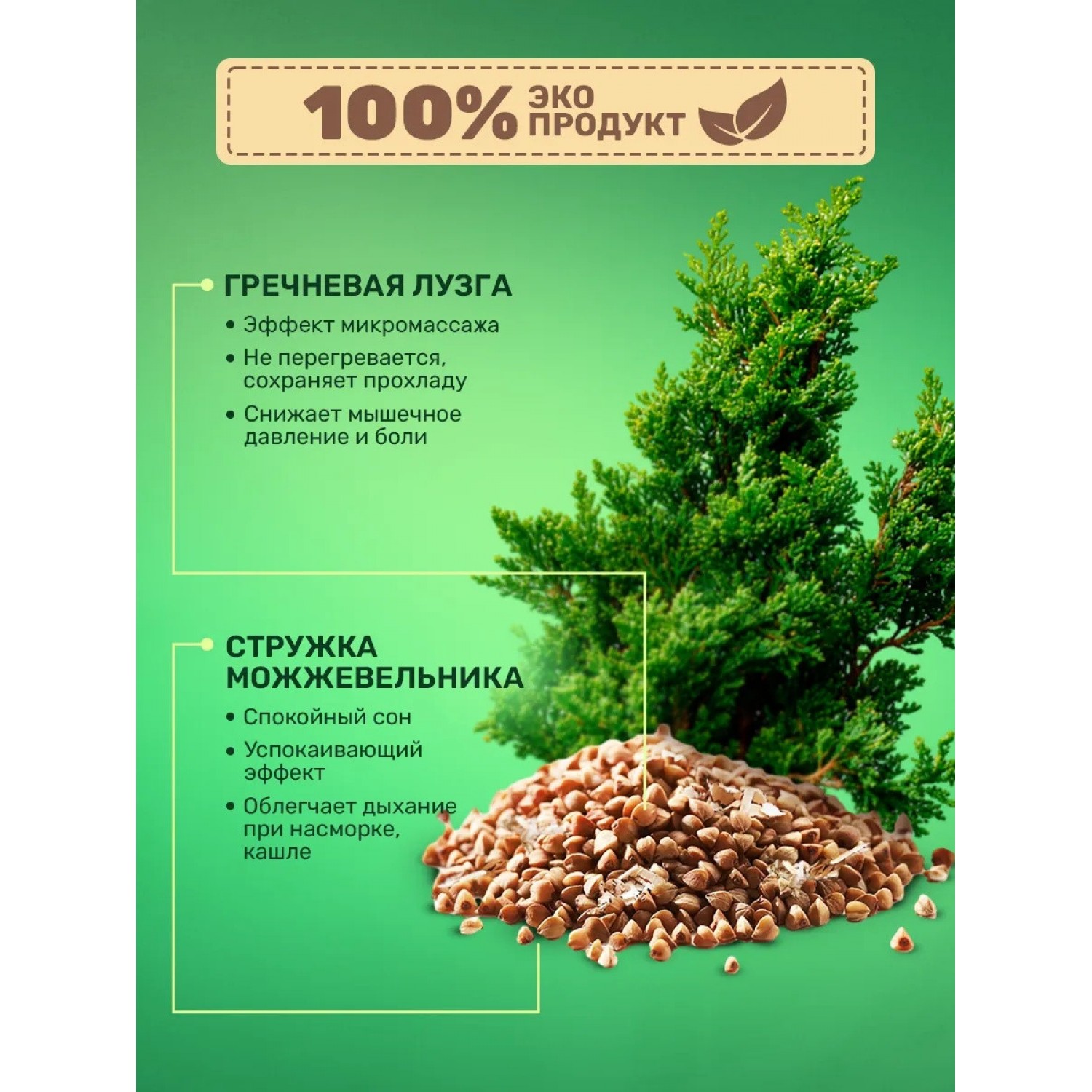 Натуральная прямоугольная подушка размером 30х35 см с наполнителем из гречневой лузги (шелухи гречихи) и можжевеловой стружки — идеальное сочетание ортопедической поддержки, комфорта и ароматерапии. Чехол выполнен из 100% хлопка, мягкого и дышащего материала, который обеспечивает оптимальный микроклимат и легкое охлаждение. Гречишные пирамидки равномерно распределяет нагрузку на шею и плечи, поддерживая правильное положение позвоночника и способствуя расслаблению мышц, что особенно важно для сна на спине. Мелкие фракции стружки можжевельника дают небольшой упругий массажный эффект, а природный хвойный аромат создает атмосферу спокойствия, благоприятствует глубокому сну и помогает от бессонницы.