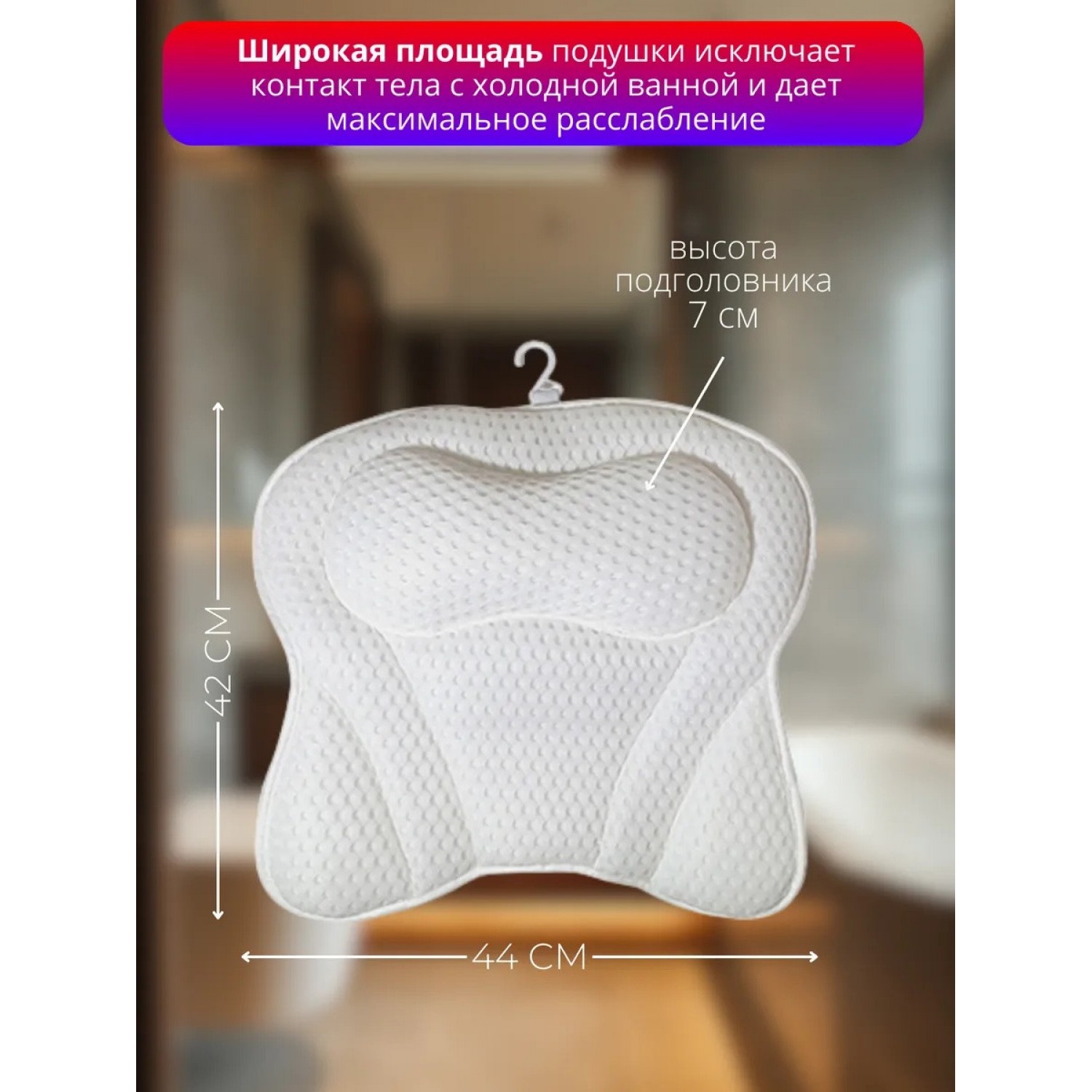 Размер подушки идеально подходит для большинства ванн и джакузи, обеспечивая максимальное удобство и поддержку. Она легко моется, что делает ее крайне практичной в использовании. Просто промойте подушку после процедуры, и она снова готова к использованию, также можно мыть в стиральной машине при 30 градусах. С помощью специального крючка, вы можете повесить подушку для просушивания и дальнейшего хранения в любое удобное место.