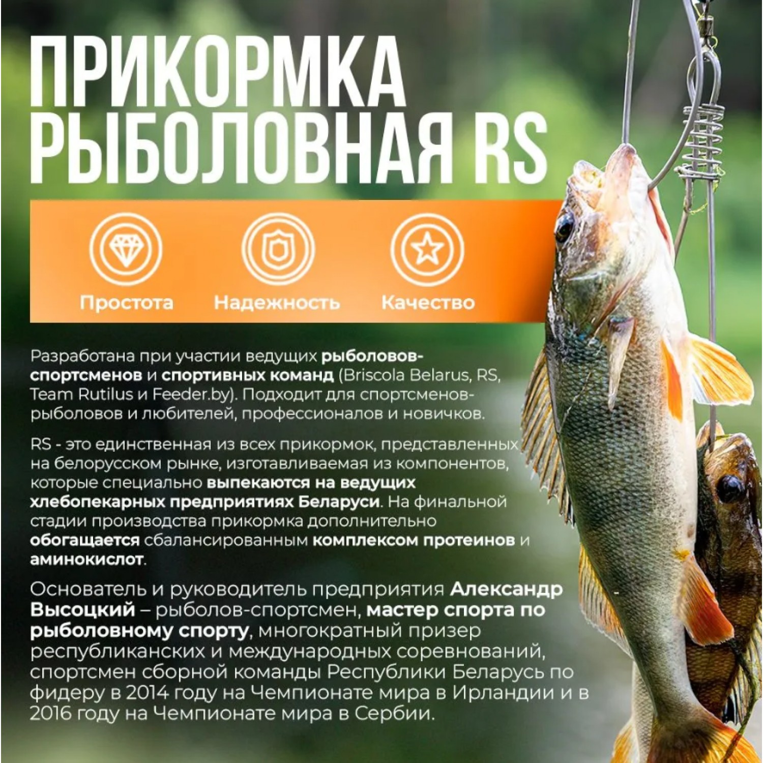 RS “Карась чеснок” - это сухая специализированная прикормка, предназначенная для ловли мирной рыбы отряда карповых в водоемах без течения (в том числе для карпфишинга). Прикорм является универсальным для привлечения белых видов речных и озерных обитателей - карася, карпа и линя. Внешне инертная самодостаточная фидерная подкормка выглядит как фракция оптимального среднего помола с малым количеством всплывающих элементов. В увлажненном состоянии она имеет мягкий светлый зеленоватый оттенок и ярко выраженный чесночный аромат в сочетании с хлебным запахом, который сильно возбуждает рыбий аппетит. Жмых создает в точке лова облако ароматной мути и заставляет рыбешку активнее искать питательные частицы. Поскольку он умеренно тяжелый, его можно легко сформировать в шар и надежно закрепить в кормушке. На базе этой летней привады можно составить собственные рецепты и увеличить с ее помощью объем прикормочной смеси, добавив, например, макуху. Для увлажнения состава потребуется 450-550 мл воды на 1 кг. Рыболовную наживку желательно крепить на донные снасти с легкой и чувствительной оснасткой: леска должна перемещаться свободно и не образовывать петлю. Корм данного бренда разработан с непосредственным участием и на основе личного опыта ведущих рыболовов-спортсменов и спортивных команд Беларуси (Briscola Belarus, Team Rutilus, Feeder by); подходит для профессионалов, любителей и новичков. Компоненты специально выпекаются на флагманских хлебопекарных предприятиях и обогащаются сбалансированным протеиново-аминокислотным комплексом. Продукция выпускается на современном оборудовании и непрерывно проходит контроль качества. Основатель и руководитель марки - действующий мастер спорта, многократный призер республиканских и международных соревнований, спортсмен сборной РБ по фидеру в 2014 году на Чемпионате мира в Ирландии и в 2016-м на ЧМ в Сербии Александр Высоцкий. Рыбалка станет для вас намного приятнее, а улов заметно увеличится после покупки набора этой замечательной приманки!