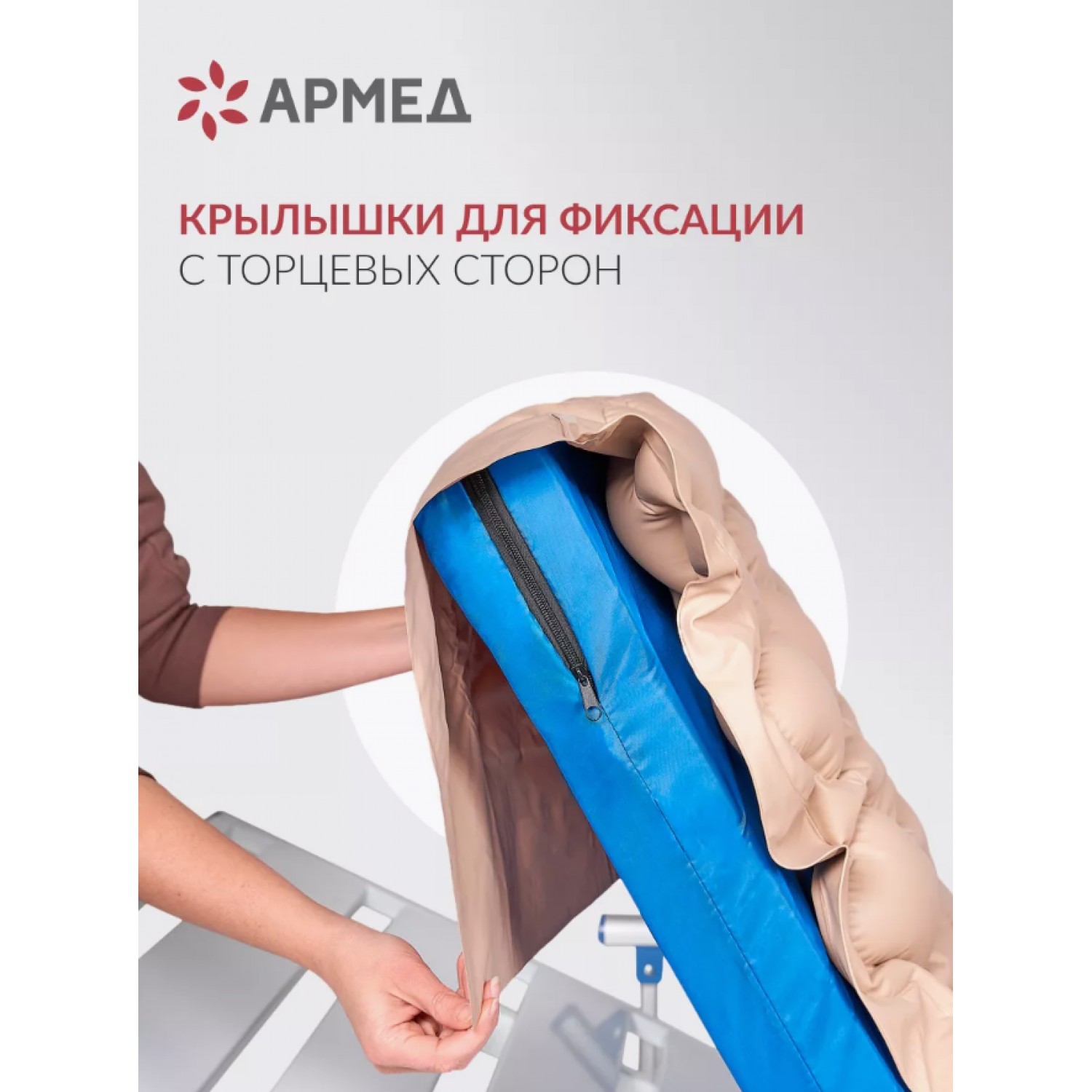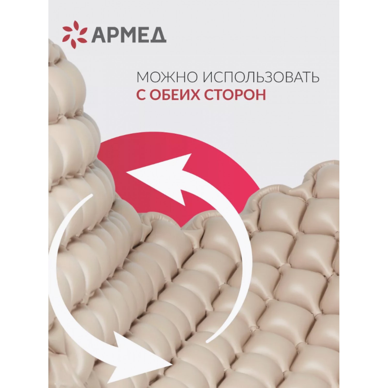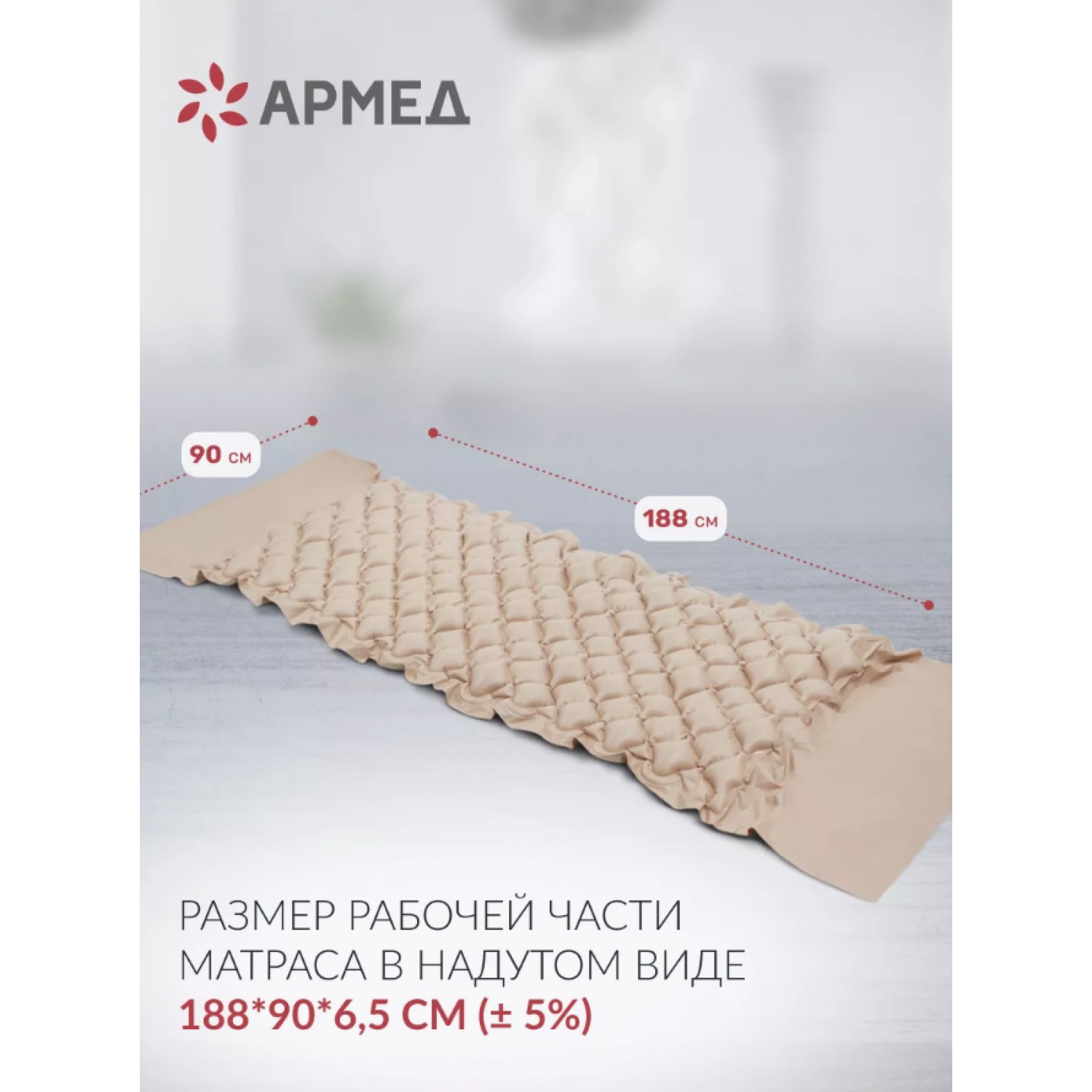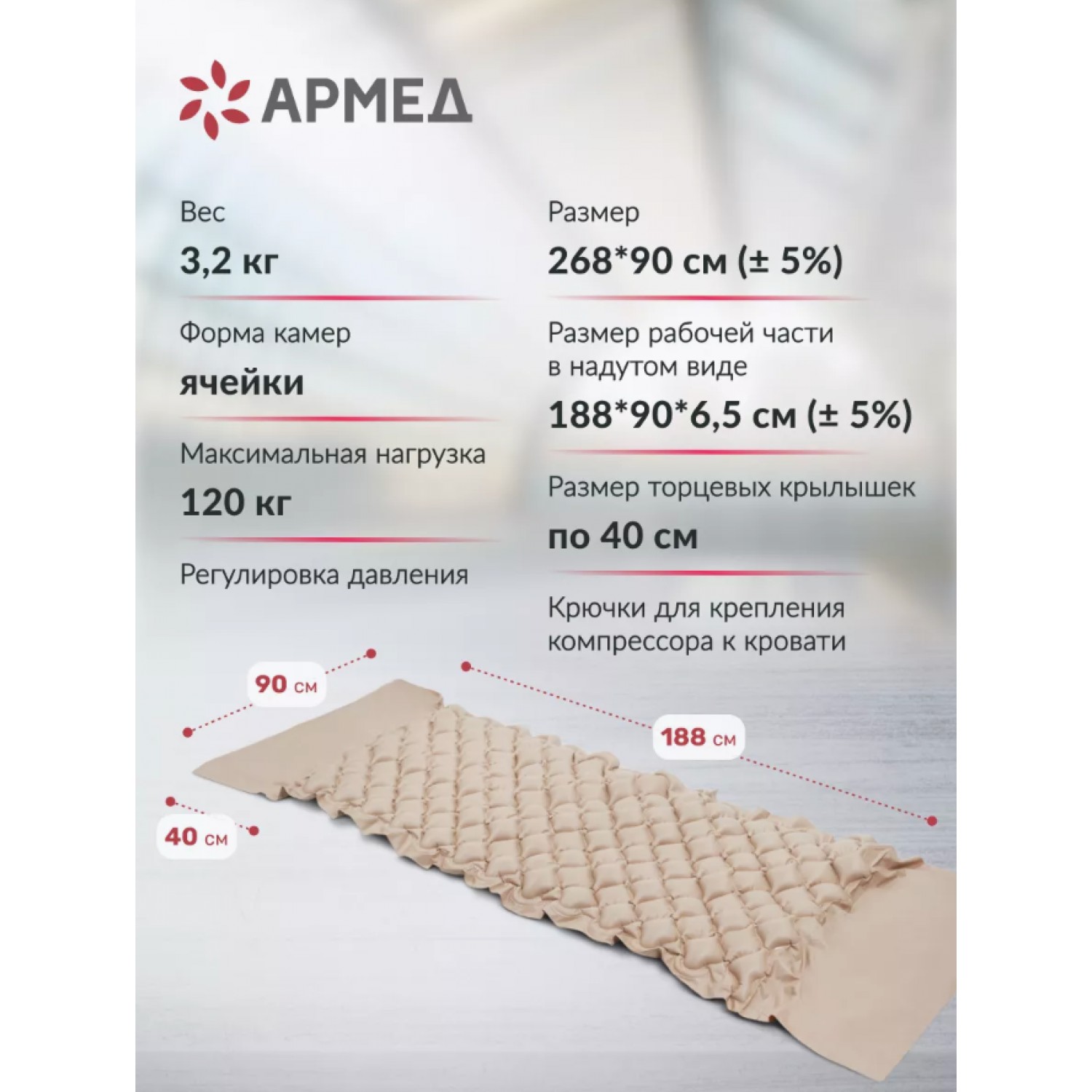 Противопролежневый ячеистый матрас Армед DGC001-1 предназначен для профилактики и лечения пролежней у лежачих больных и инвалидов. Матрас оснащен 130 секциями с подворотами, которые наполняются воздухом с помощью компрессора. Компрессор крепится на поручень кровати и равномерно распределяет давление по разным ячейкам, обеспечивая качественный профилактический массаж прилегающих тканей. Плавная регулировка давления антипролежневого матраса позволяет выбрать оптимальную плотность для максимального комфорта пользователя. Широкие крылья с торцовых сторон обеспечивают надежное крепление матраса к кровати, предотвращая его скольжение. Потребляемая мощность компрессора составляет всего 10 ВА, что делает матрас экономичным в использовании. Он подходит для пациентов с различными заболеваниями опорно-двигательного аппарата, пожилых людей, а также взрослых после травм и операций. Принцип работы матраса заключается в циклическом наполнении и спуске воздуха в разных секциях, что создает эффект массажа и улучшает кровообращение, предотвращает гипоксию тканей. Цикл работы составляет 5-6 минут. Анатомическая форма матраса обеспечивает правильное положение тела и уменьшает давление на кожу, что способствует сохранению здоровья кожи. Для достижения максимальной эффективности необходимо учитывать вес пациента – он не должен превышать максимальную грузоподъемность матраса, которая составляет 120 кг. Размеры матраса составляют: длина 268 см, ширина 90 см, высота 6,5 см. Длина без подворотов составляет 188 см. Матрас надувной с компрессором от компании Армед - это надежный и удобный инструмент для профилактики пролежней и улучшения состояния кожи у пациентов, проводящих длительное время в постели. Он станет незаменимым помощником для тех, кто стремится сохранить здоровье своей кожи и избежать появления пролежней.