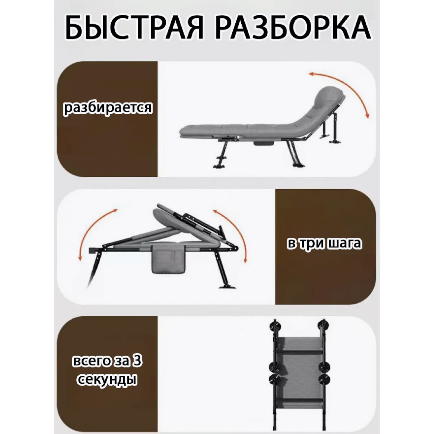 Кровать туристическая раскладушка - карповая раскладушка для туристических поездок, кемпинговых лагерей, как дополнительная раскладная кровать или спальное место на даче. Можно использовать как кресло, как шезлонг или кровать. Размер: как раскладушка 195х64х30см. В сложенном виде 85х60х17см. Кресло, кровать - раскладушка, спинка регулируется в 6 положениях.