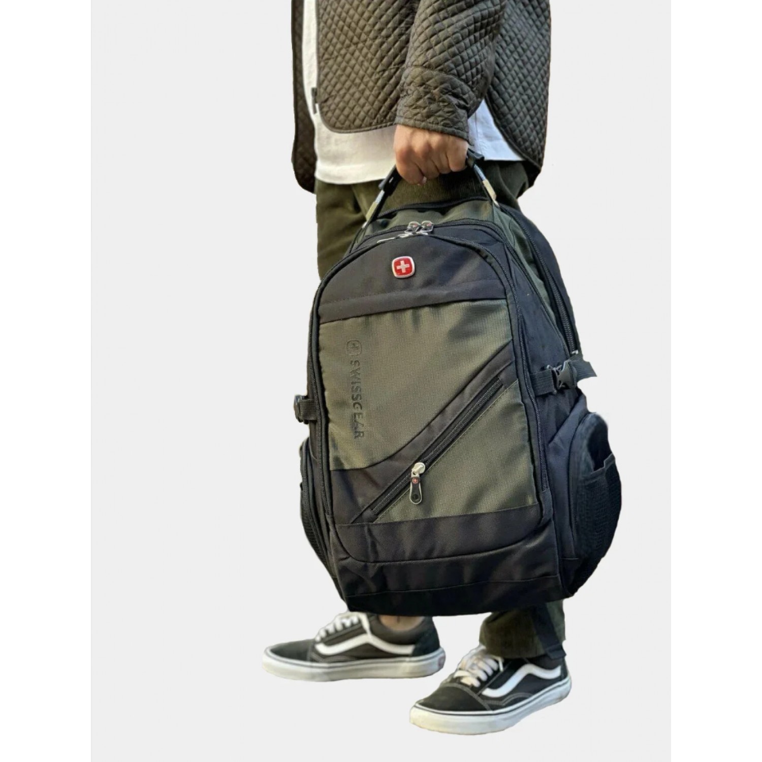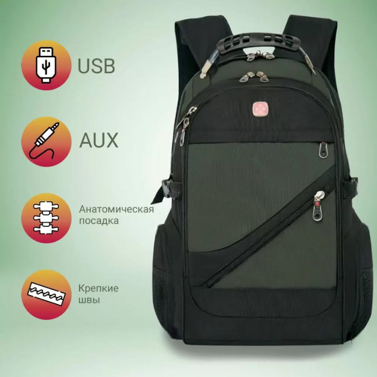 Рюкзак SwissGear сделан из качественных материалов, пошит из прочной водоотталкивающей ткани. Удобные лямки-ремни с массажными подушками и ортопедическая спинка создают максимальный комфорт для плечей и позвоночника. Спинка рюкзака оснащена технологией AirFlow, что обеспечивает хорошую циркуляцию воздуха. В рюкзаке продумана каждая деталь. В передней части рюкзака имеется небольшой карман для небольших предметов. Далее идёт отделение побольше, куда можно положить планшет. Следующее отделение сделано как органайзер, куда можно разместить мобильный телефон, ручку, планшет, ключи, книжку, ежедневник и др.