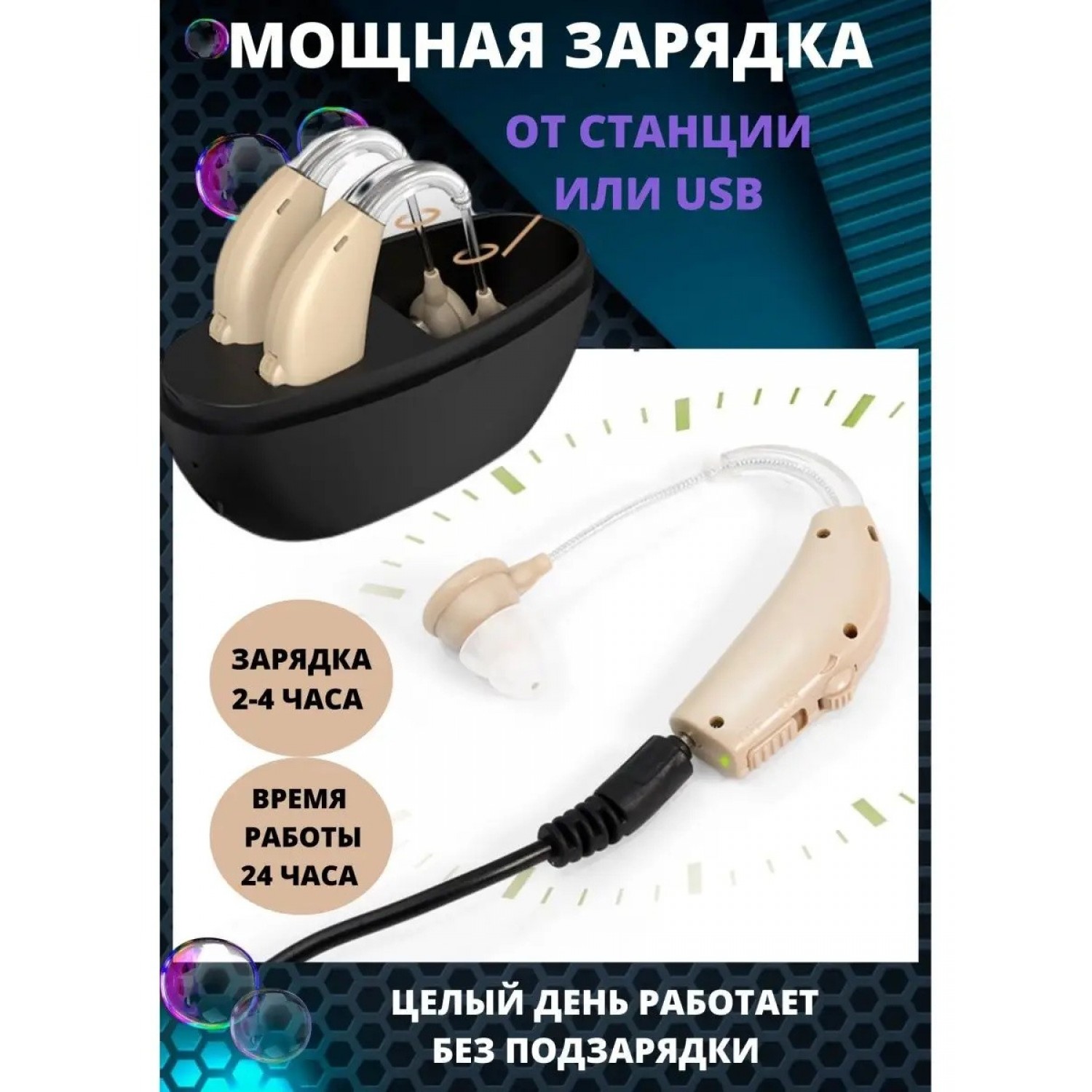 3. Слуховые аппараты можно заряжать в течение 3 часов и использовать в течение 21 часа. Перезаряжаемый футляр для хранения полностью заряжен и позволяет зарядить аппарат 3-4 раза.