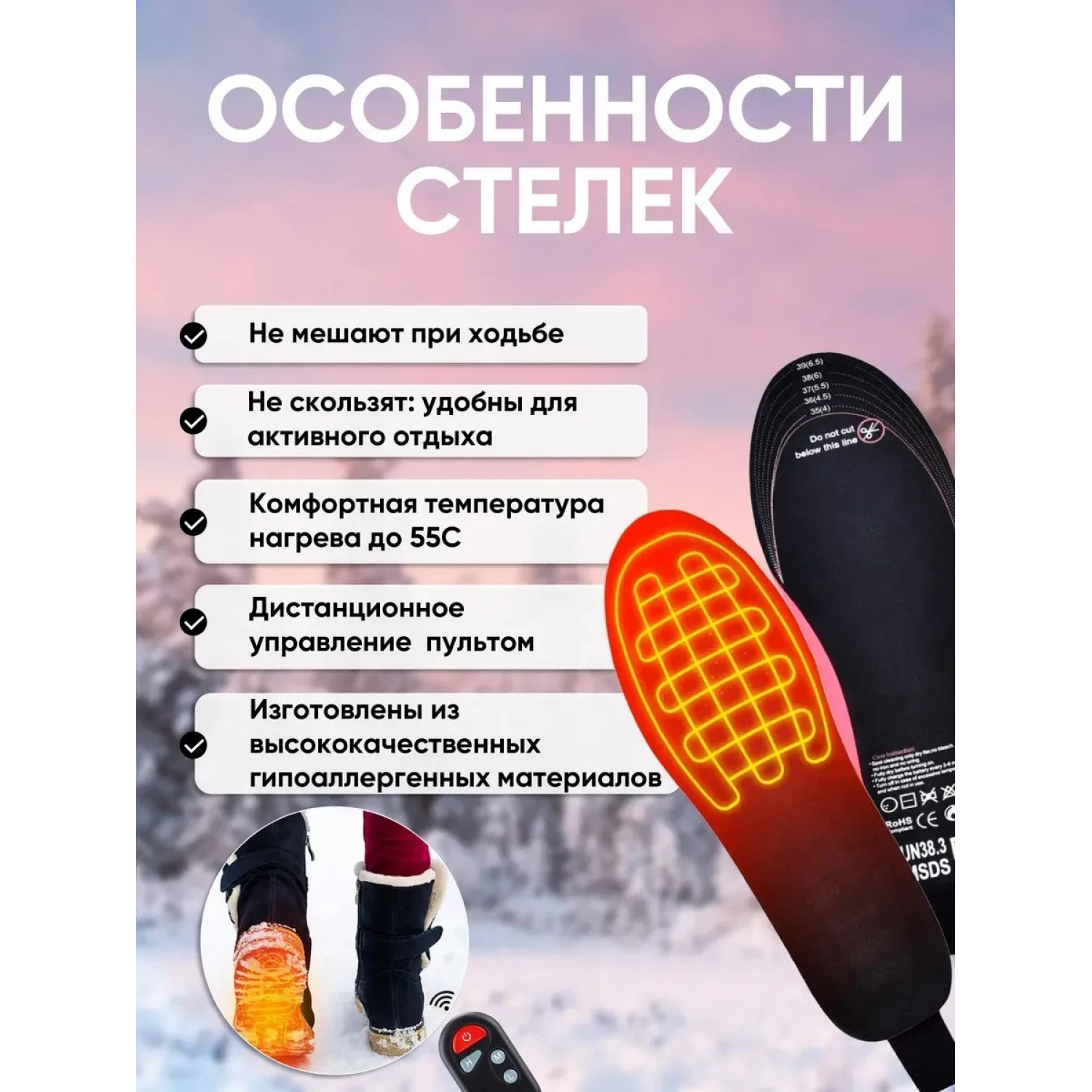 Управление осуществляется с пульта дистанционного управления, что делает их использование невероятно удобным и легким. Пульт имеет световой индикатор работы, показывающий текущий режим активности. Зимние, теплые стельки подходят как для мужчин, так и для женщин, охватывая универсальные размеры с 41 по 45. Многоразовые электрические термостельки за счет инновационного способа изготовления обладают антибактериальным свойством и удобно лежат даже в спортивной обуви. Подогрев от аккумулятора через USB-кабель от сети 220В позволяет экономить на батарейках. Размер обрезается по линии среза от 41-го до 45-го.