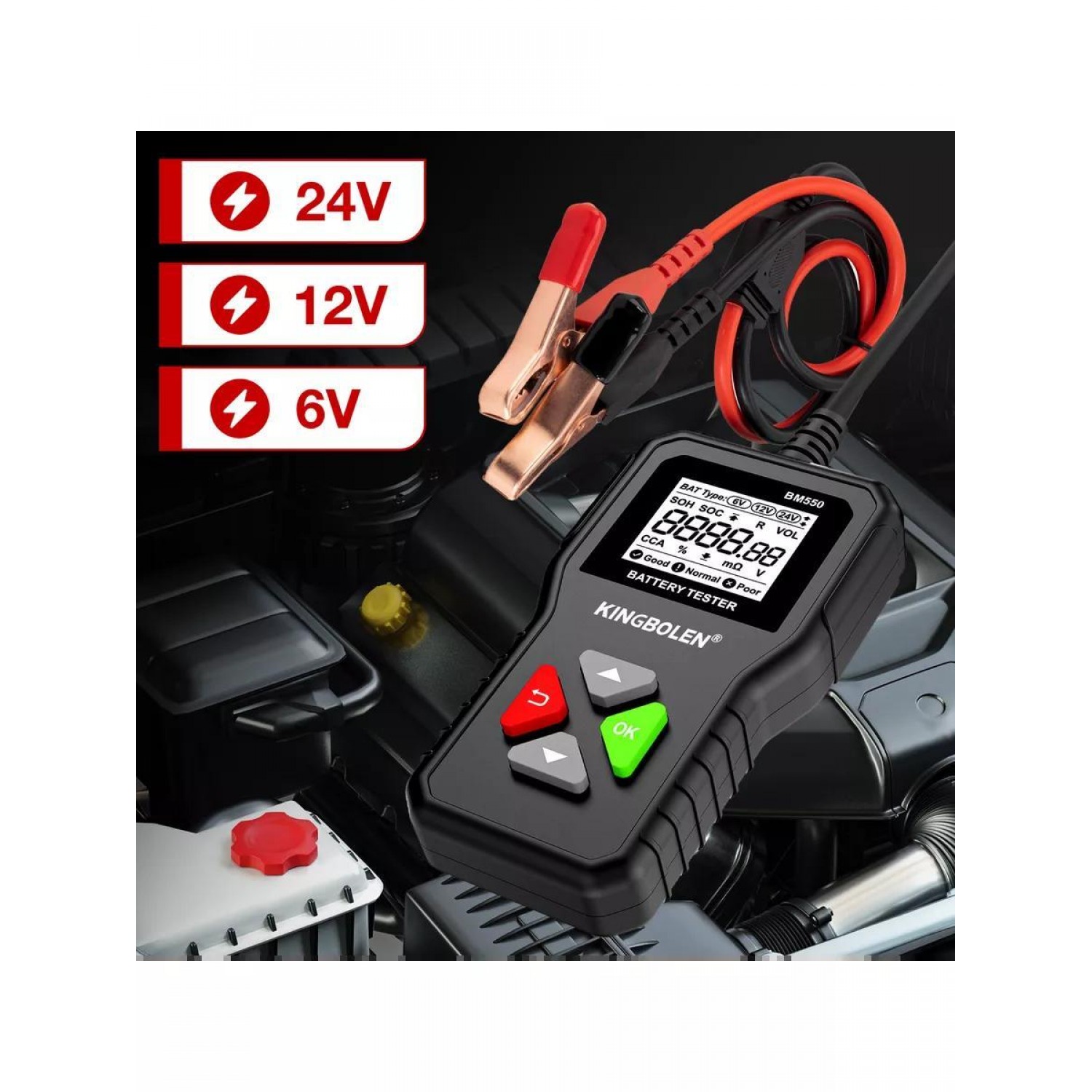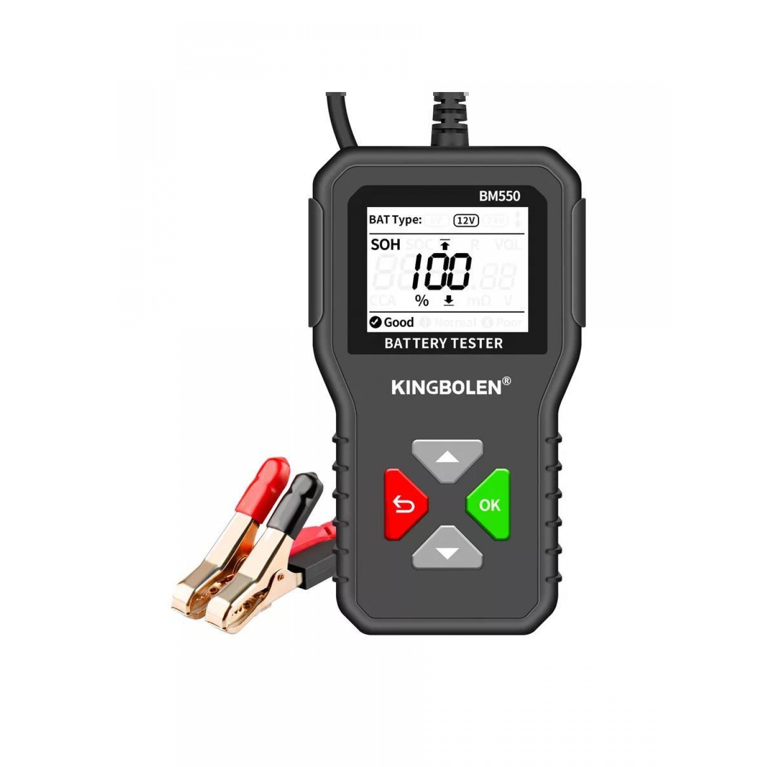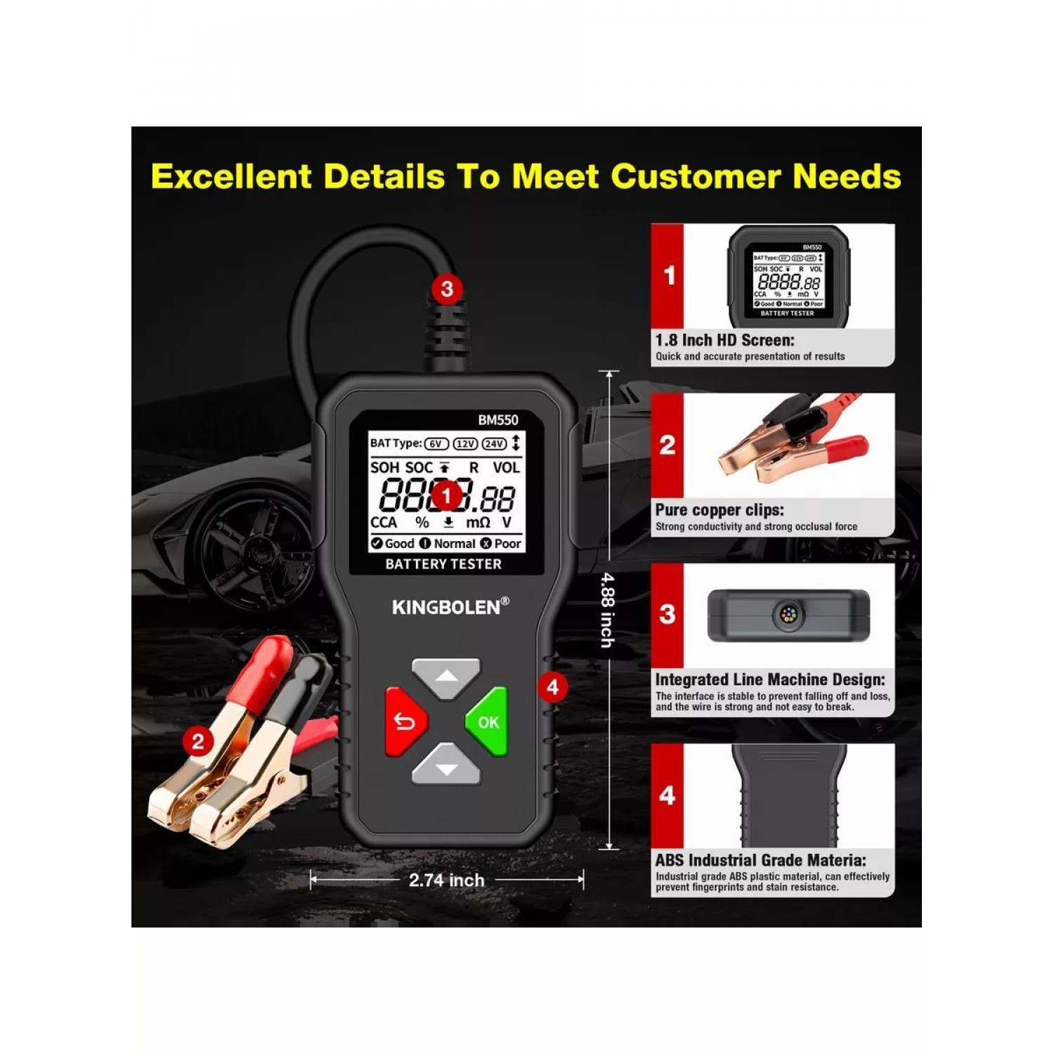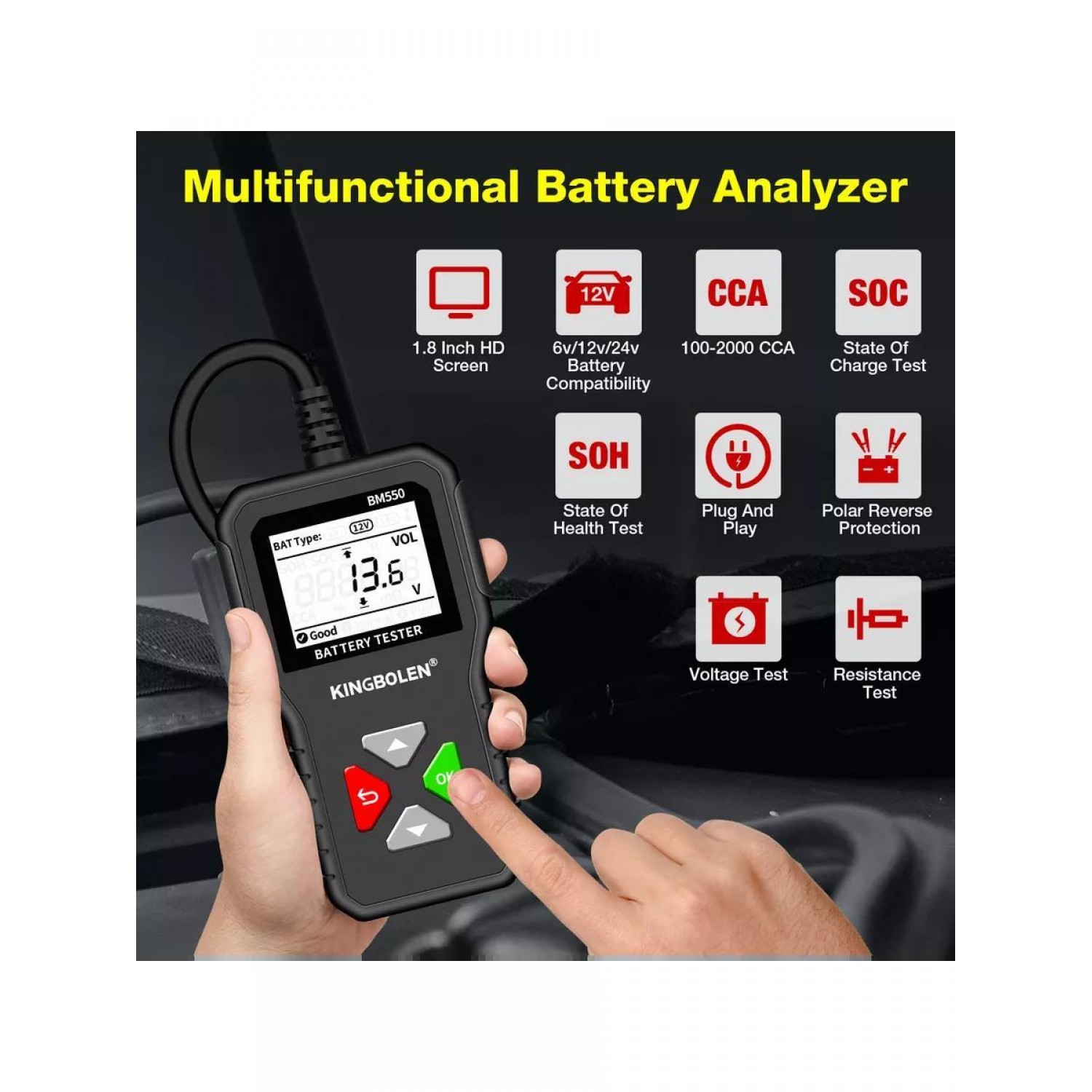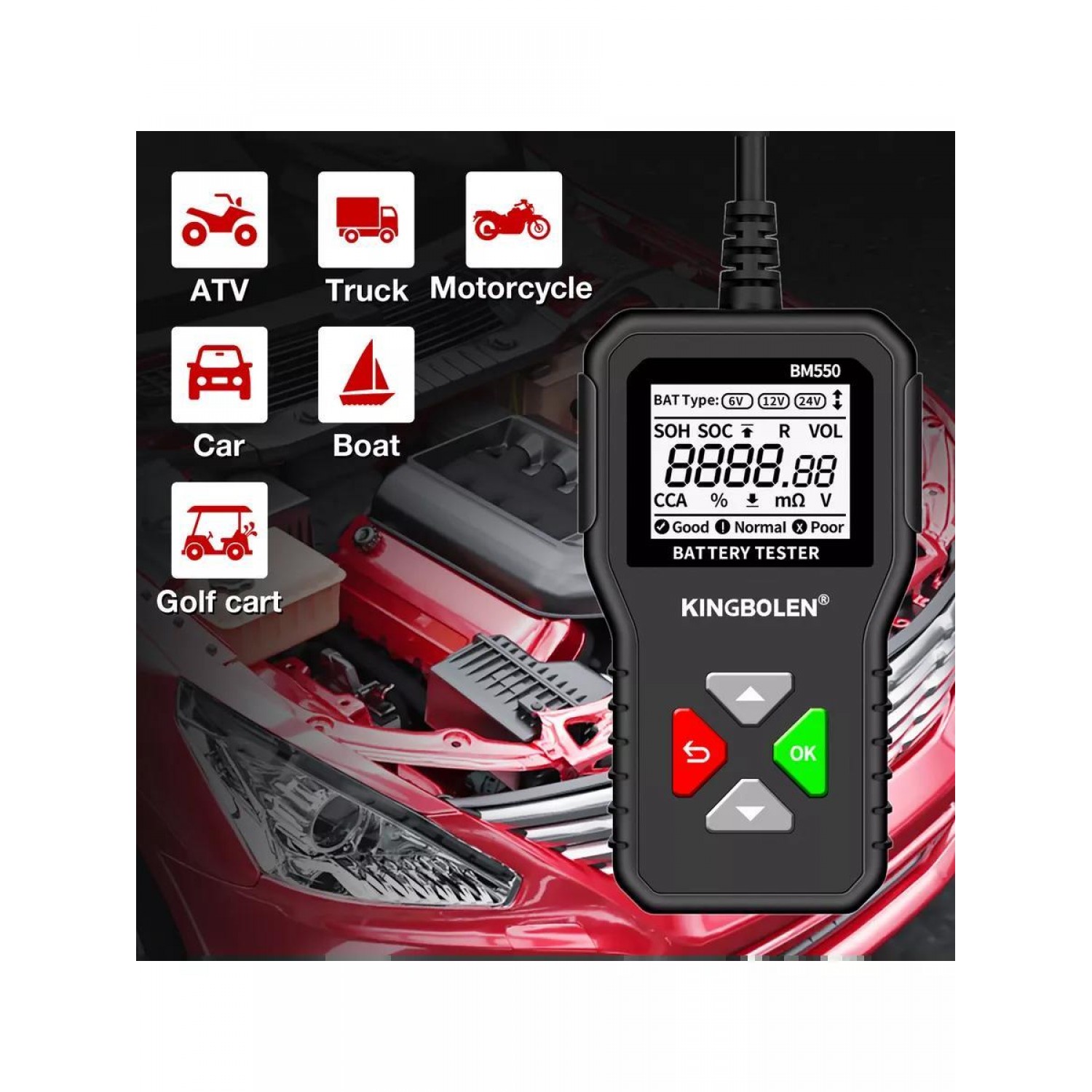 Тестер аккумуляторов 6V12V24V: KINGBOLEN BM550 может тестировать все автомобильные аккумуляторы 6V/12V/24V/ 100-2000CCA, поддерживает 2Ah-220Ah (необходимо ввести соответствующее значение CCA на аккумуляторе), включая обычные свинцово-кислотные (обычные аккумуляторы), AGM плоские (AGM плоские аккумуляторы), AGM спиральные (AGM витковые аккумуляторы), GEL и EFB аккумуляторы, анализатор автомобильных и грузовых аккумуляторов и т.д. (не подходит для глубоких циклических аккумуляторов).