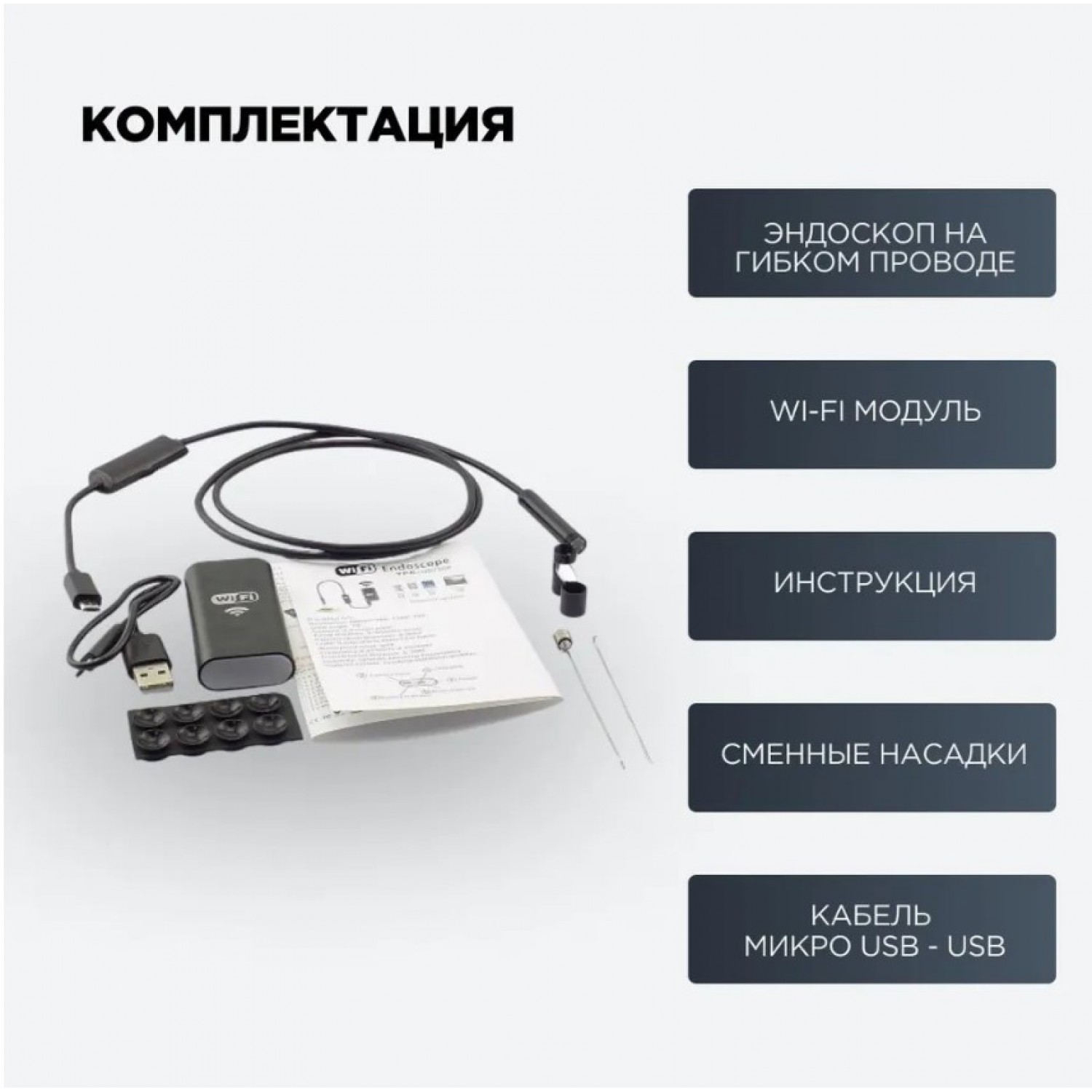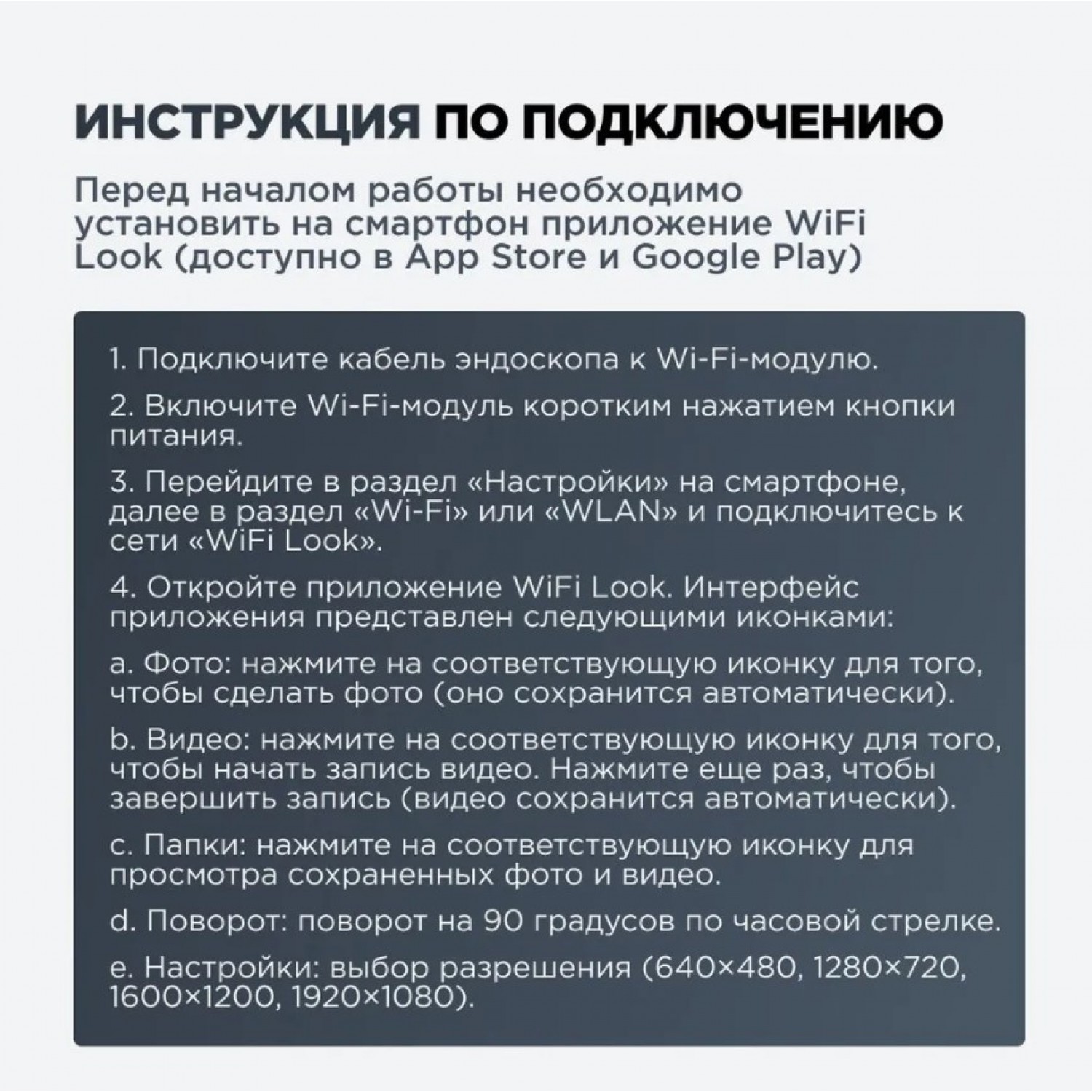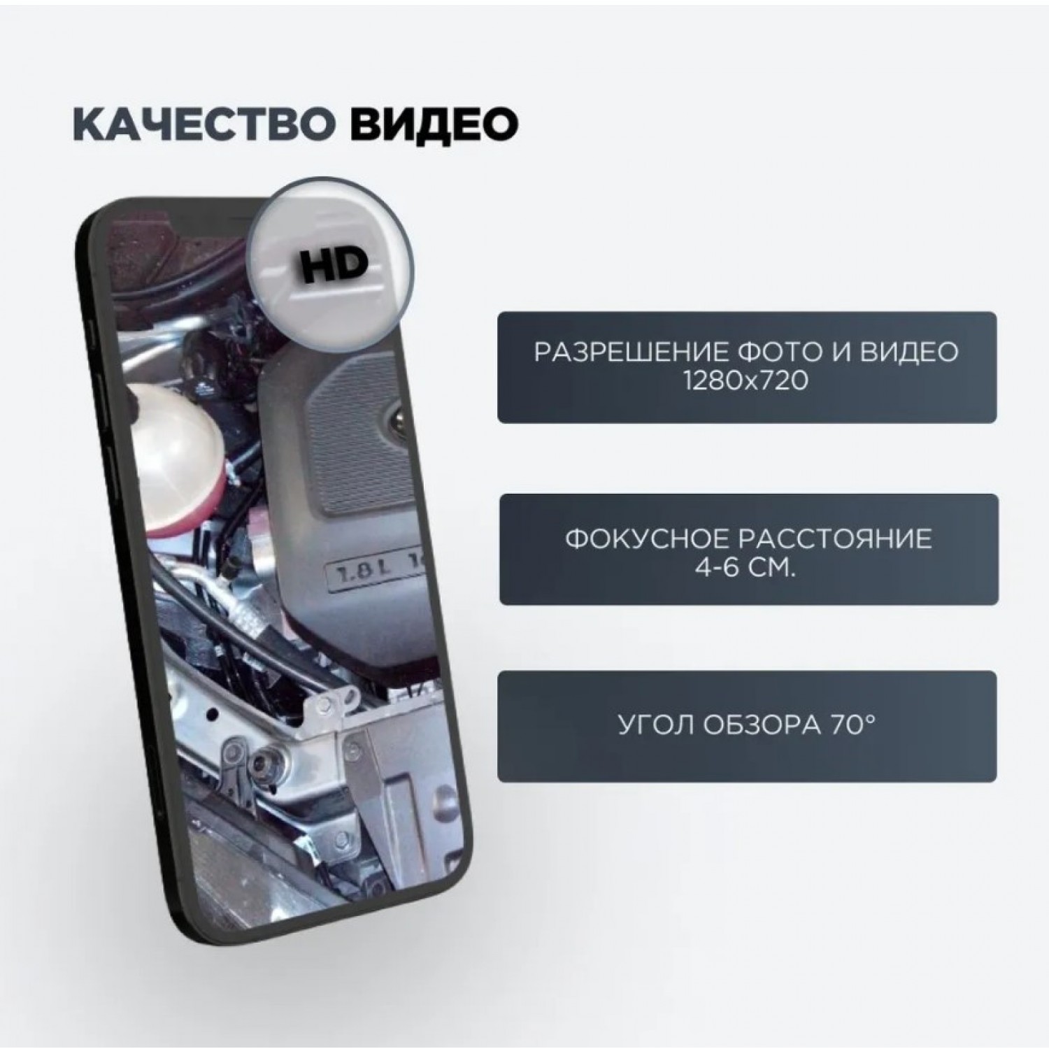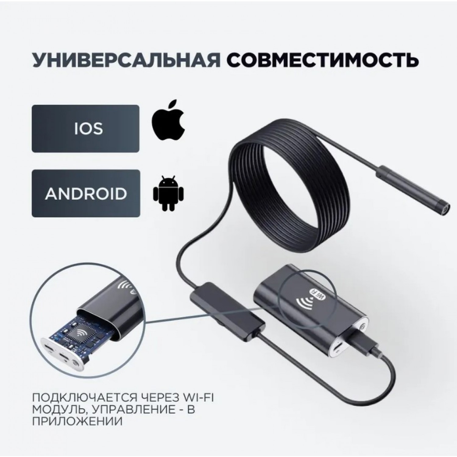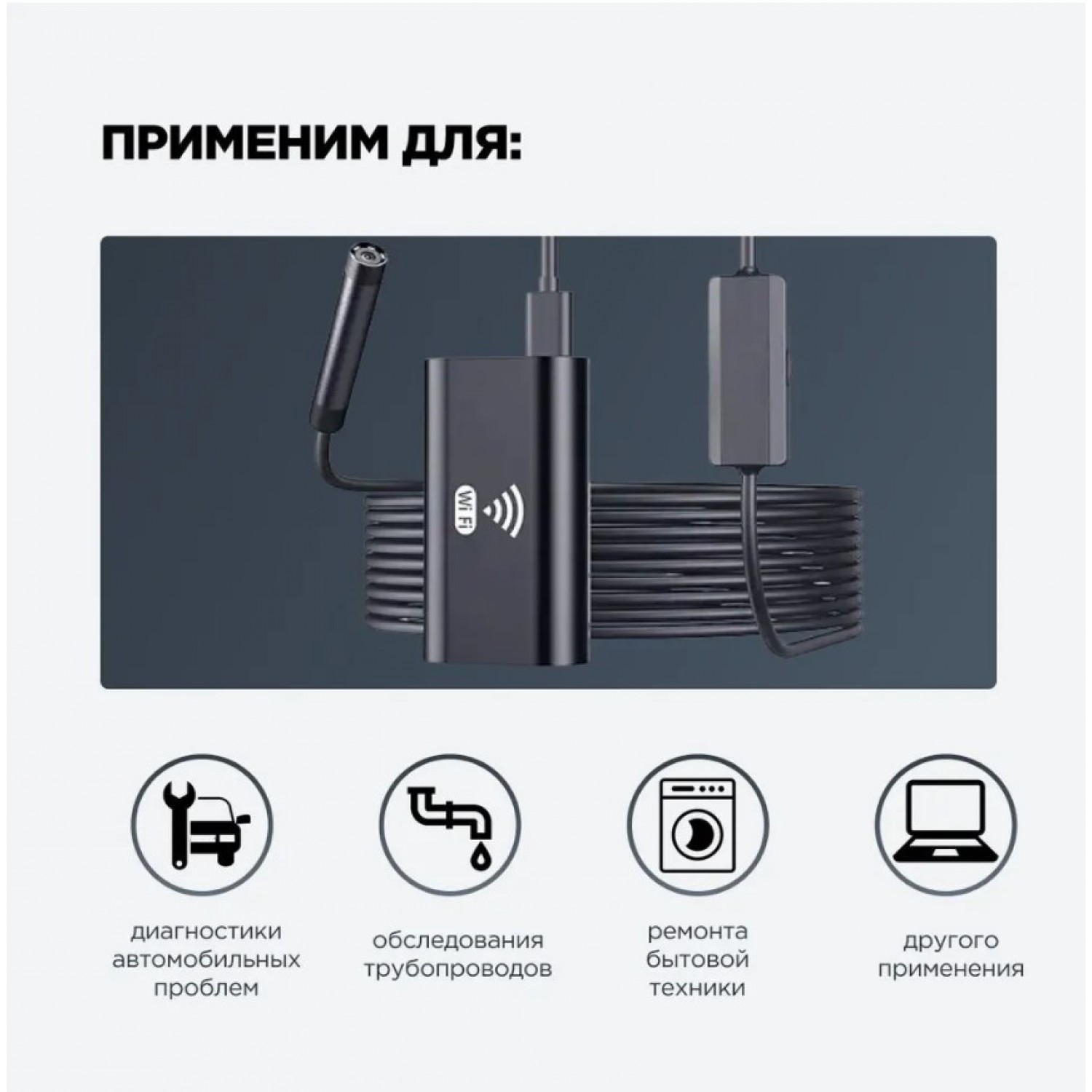 Видеоэндоскоп WiFi HD720P представляет собой гибкий эндоскоп с беспроводной технологией передачи данных. Подходит для применения на электронных устройствах под управлением ОС Windows, Android или iOS и поддерживающих функцию Wi-Fi. Эндоскоп предусмотрен для визуального осмотра оборудования и труднодоступных мест, отлично подойдет для осмотра труб и систем вентиляции, ремонта и диагностики автомобилей и электронной техники. Имеет гибкий зонд на жесткой проволоке длиной 1 м и объективом диаметром 8 мм с регулируемой светодиодной подсветкой, благодаря чему обеспечивается хорошее освещение рабочей зоны. Видеоэндоскоп WiFi HD720P имеет влагозащитный корпус по стандарту IP67, благодаря чему полностью защищен от пыли и прослужит долго.