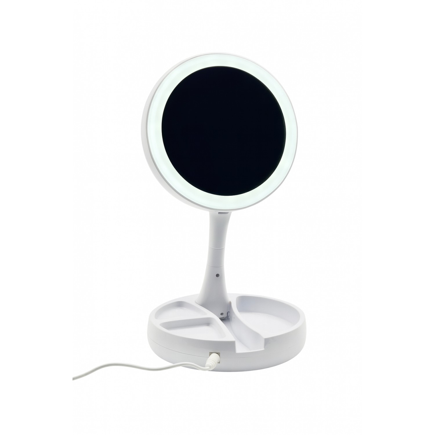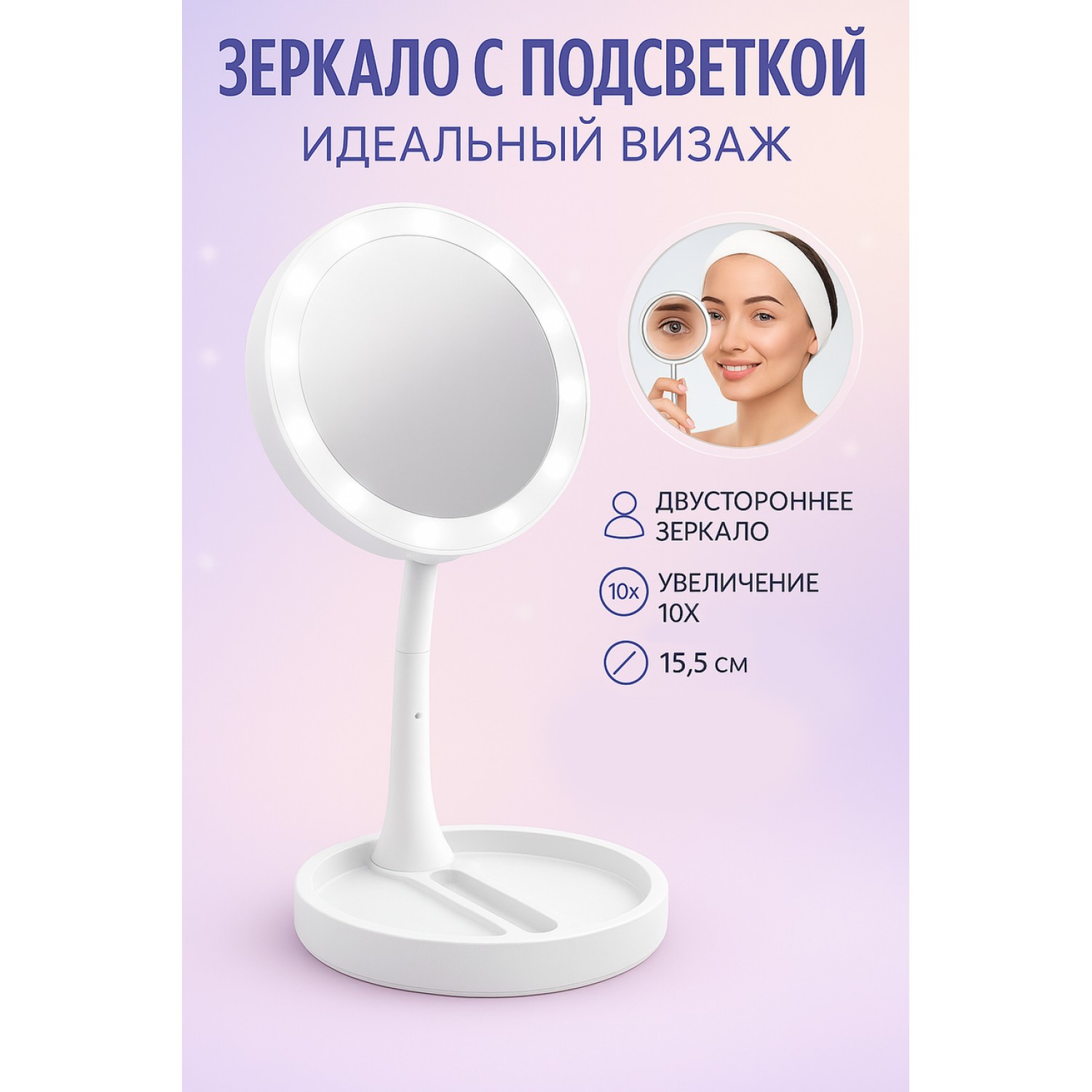 Двустороннее косметическое зеркало со светодиодной подсветкой — незаменимый аксессуар для идеального макияжа и ухода за кожей. Это зеркало с увеличением обеспечивает чёткое и детальное отражение благодаря мощному 10-кратному увеличению на одной стороне и обычному отображению на другой. Особенности зеркало с подсветкой для макияжа с увеличением настольное двухстороннее: Светодиодная подсветка из 15 суперярких светодиодов на обеих сторонах обеспечивает идеальное освещение даже в тёмном помещении. Двустороннее у увеличивающее зеркало позволяет легко переключаться между обычным видом и увеличением для точной работы с макияжем или уходом за кожей. Зеркало увеличивающее для макияжа с подсветкой оборудовано встроенным органайзером для аксессуаров, где удобно хранить кисти, спонжи, украшения и другие мелочи. Светодиодные индикаторы рассчитаны на долгий срок службы — до 30 000 часов. Компактное и лёгкое зеркало легко переносить и использовать как дома, так и в поездках. Работает от 4 батареек AA/LR6 (пальчиковых, не входят в комплект), а также может питаться от сети 220V через USB-кабель питания (входит в комплект). Сетевой адаптер USB приобретается отдельно. Характеристики: Подсветка: 15 светодиодов. Тип питания: батарейки АА / LR6 или питание от сети 220V через USB-кабель. Размер: удобный формат для настольного использования. Преимущества: Косметическое зеркало с подсветкой идеально подходит для нанесения макияжа, ухода за кожей, бритья и других процедур, требующих точности. 10-кратное увеличение позволяет рассмотреть мельчайшие детали. Компактный дизайн и возможность работы от батареек делают зеркало отличным вариантом для использования в поездках. Встроенный органайзер помогает поддерживать порядок на туалетном столике. Выбирайте двустороннее косметическое зеркало с подсветкой — идеальное сочетание стиля, функциональности и практичности для вашего ежедневного ухода за собой!